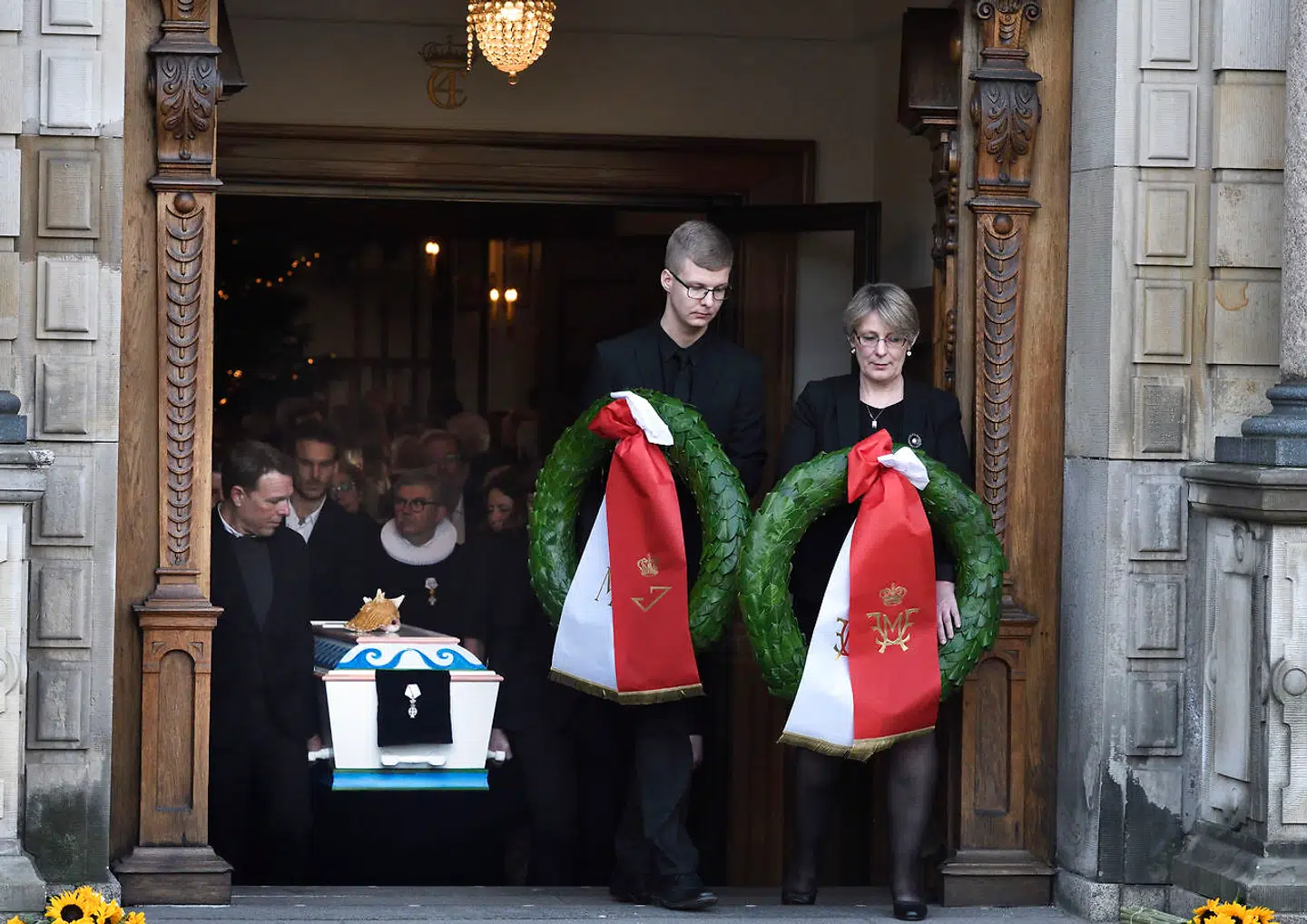 Foran den særprægede kiste, som Troels Kløvedal selv havde været med til at designe, stod kranse fra både kronprins Frederik, kronprinsesse Mary, prins Joachim og prinsesse Marie.