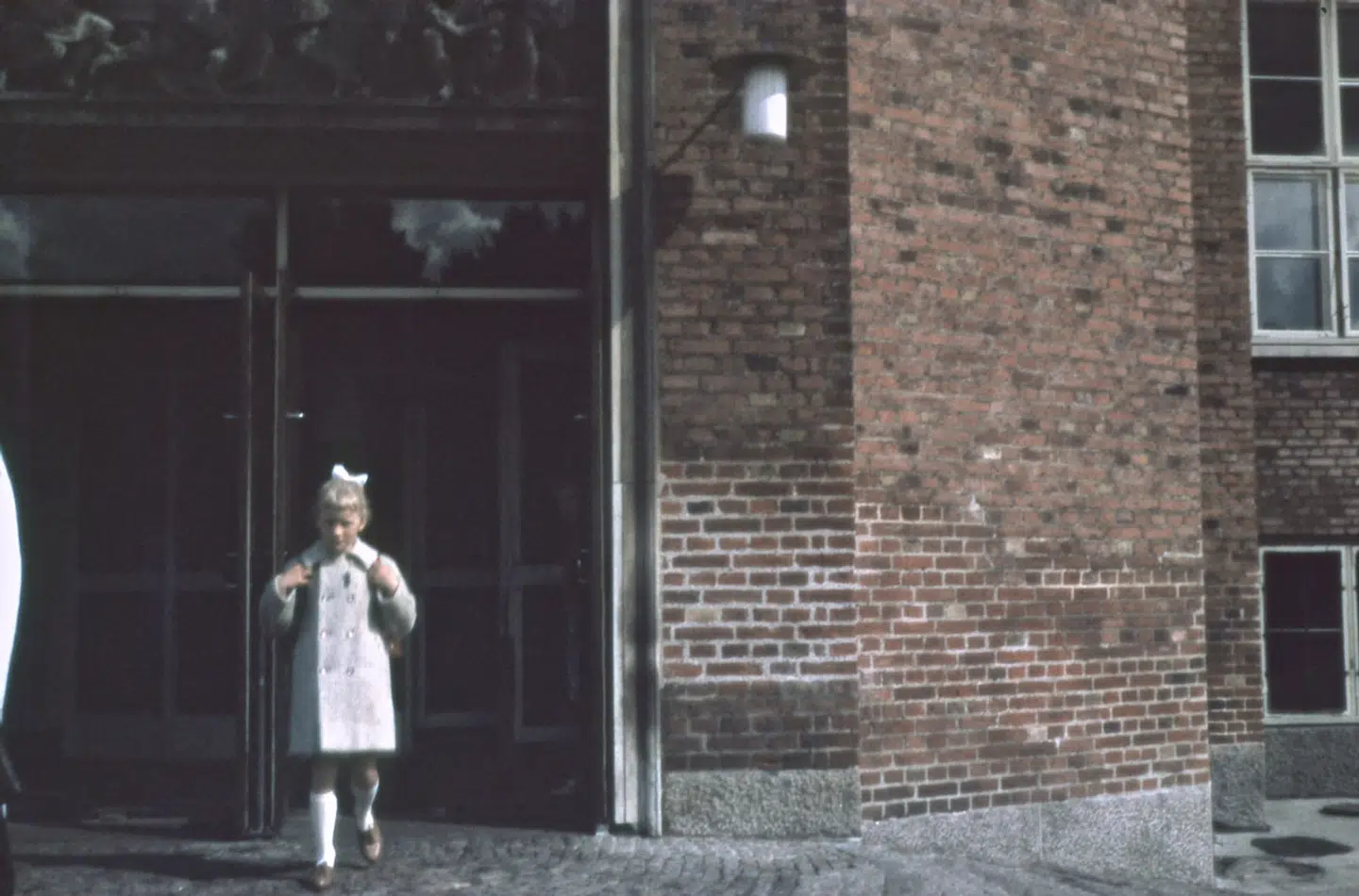 Her fra første skoledag på Søndermarksskolen på Frederiksberg. Min søster og jeg havde altid meget fine, velstrøgne sløjfer i håret, som min mor friserede og glattede. Det blev sat op i en hestehale, rottehaler eller fletninger. Det meste af af vores tøj var hjemmesyet – også frakken – og vi gik alle dengang med fine sko, ikke bare snøresko. På Frederiksberg var vi meget forskellige, nogle boede i de store villaer, og vi andre i lejligheder, et blandet klientel, men vi var af samme kultur. Og der var masser af fritidsbeskæftigelser på skolen, man kunne gå til tegning, maling, stoftryk og syning. Jeg gik til håndbold, fra jeg var 11, til jeg gik ud af gymnasiet og var også blåmejse-spejder. Jeg var mest til de kreative fag som musik, hvor jeg sang, og til dansk og maling – i dag maler jeg faktisk billeder, når jeg har tid.