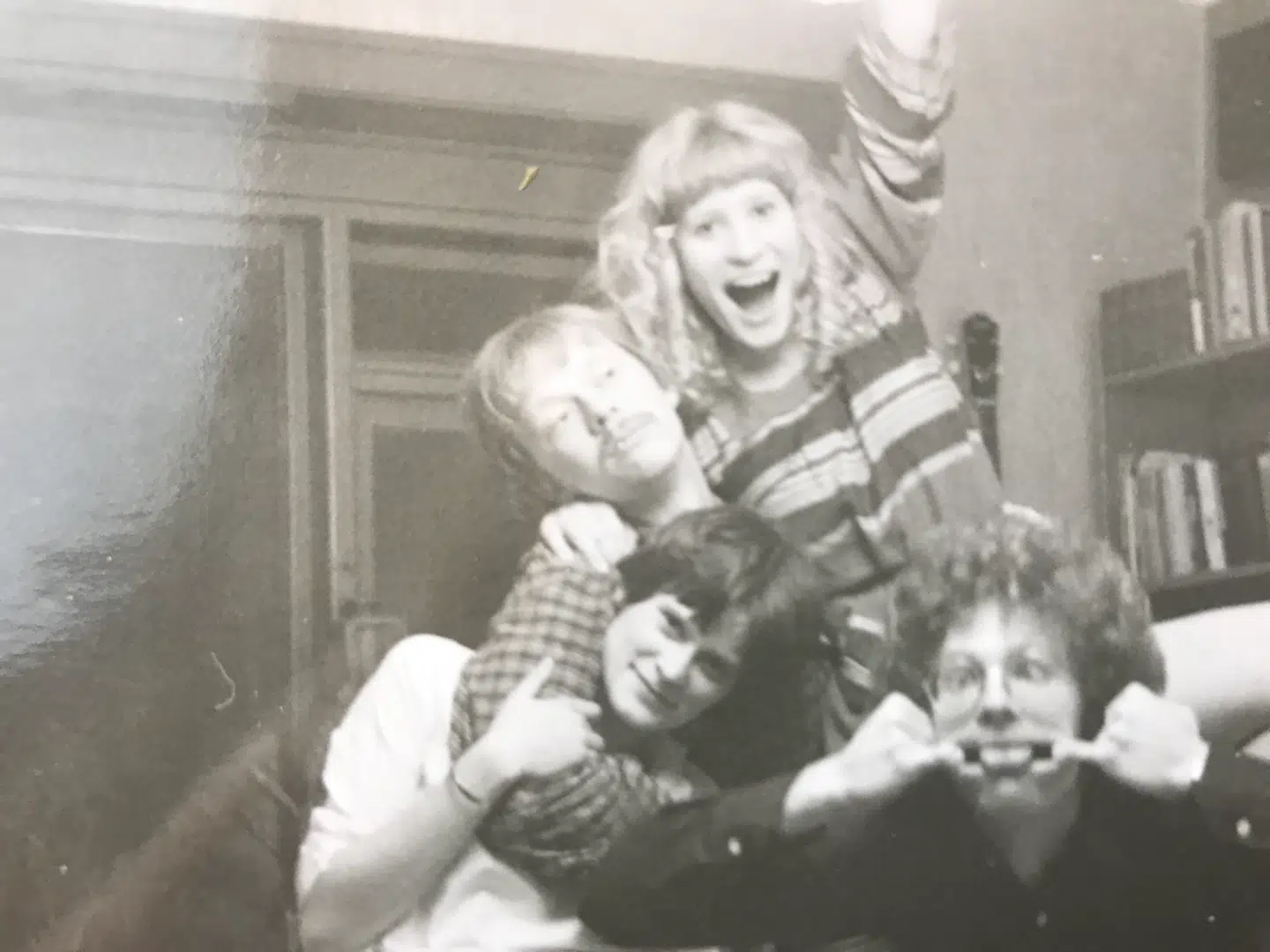 Der var højt humør her i 1978, da jeg lige havde fået at vide, at jeg var kommet ind på Skuespillerskolen i Aarhus, hvor jeg begyndte året efter. Man kunne søge tre skoler, den første var Aarhus, og der søgte 600-800 om at komme ind til en af de fem pladser det år. Thomas Eje kom jeg til at gå sammen med – han var så gennemmusikalsk, og vi var flere, der gerne ville lave musicals, men det var ikke så populært dengang. På billedet er komponist Andy Pape og tegnefilmsinstruktør Peter Røsche.