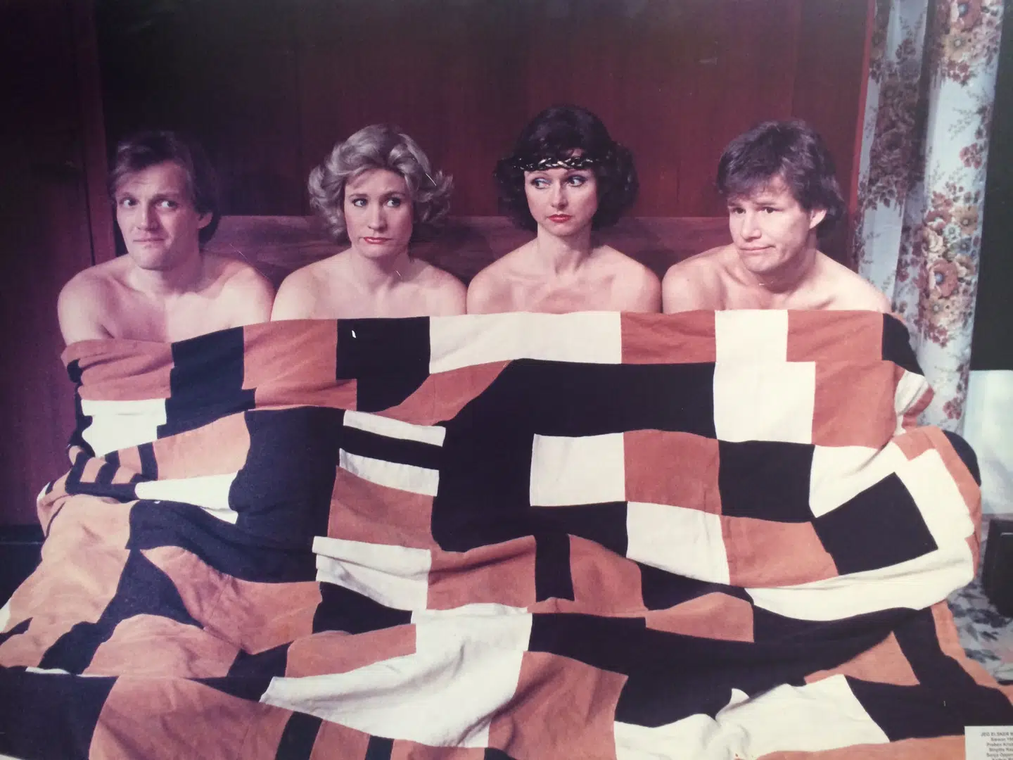 Billedet her er fra forestillingen ’Jeg elsker min kone’, som spillede to sæsoner på Nørrebros Teater. Det er Preben Kristensen, mig, Sonja Oppenhagen og Anders Bircow, og vi fik i huj og hast nogle mærkelige parykker på. Forinden havde Preben og jeg været på turné med den samme forestilling, og her besøgte Prebens mand Søren Hedegaard os. Jeg havde på det tidspunkt langt hår, men en eftermiddag, hvor vi kedede os lidt, designede Søren Hedegaard den frisure, som blev Susan Himmelblå-frisuren. Søren har blik og flair for stil. Han er i dag dronning Margrethe og kronprinsesse Marys personlige stylist og frisør. Min københavnerdebut på teatret var i forestillingen ’Da jazzen kom til byen’, som var nyskrevet til Linie 3, og som blev spillet på Betty Nansen Teatret, hvor Morten Grunwald var direktør. Her mødte jeg Erik Balling, som kom og så forestillingen, og han sagde bagefter til mig, at jeg havde filmudstråling, og at han gerne ville lave film med mig. Efter nogen tid ringede han til mig med et filmtilbud, men jeg sagde nej, for jeg havde planlagt at skulle tre måneder ’across’ USA med min daværende kæreste. Heldigvis ringede Erik Balling til mig igen senere og sagde: ’Nu har jeg rollen til dig. Du skal møde Kim Larsen og Erik Clausen og sige goddag.’