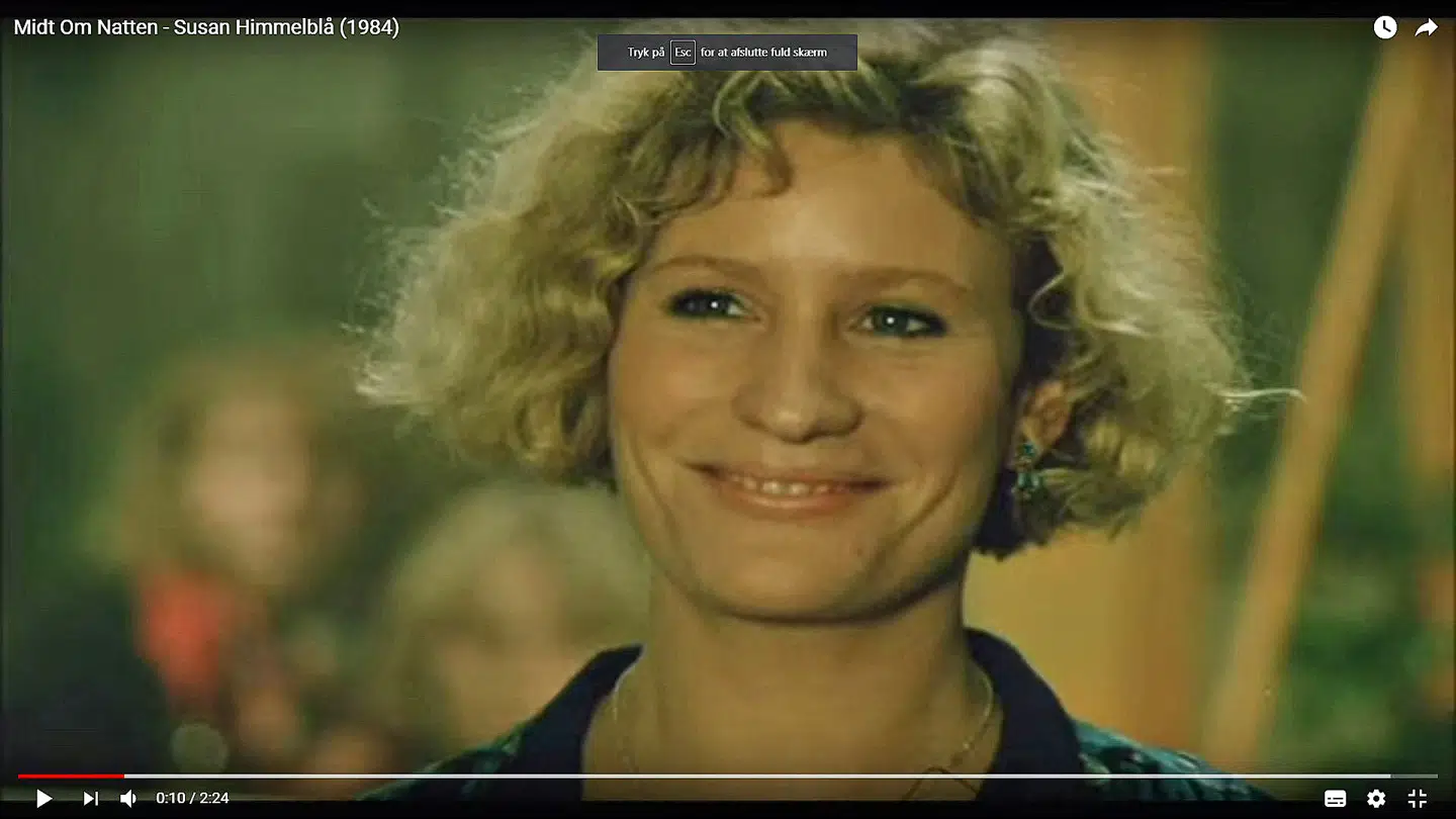 Min filmdebutrolle var som Susan Himmelblå i ’Midt om natten’. På billedet ser man, at jeg står og flirter med Kim Larsen, mens han sang på scenen i filmen, men sandheden er, at Kim slet ikke var der – jeg kiggede på en handske, en person holdt op, mens jeg hørte sangen ’Susan Himmelblå’. Men som skuespiller er det jo kunsten, at man har et indre liv, der kan ses. Det var utrolig dejligt at arbejde sammen med Erik Balling, Kim Larsen og alle de andre. Man kunne tro, det var én lang fest, men mens optagelserne stod på, var jeg på turné i Jylland og kørte frem og tilbage. Mange nætter fik jeg kun to timers søvn. De første år efter filmen kunne jeg ikke gå på gaden uden at blive genkendt – og det er stadig en rolle, som mange husker.