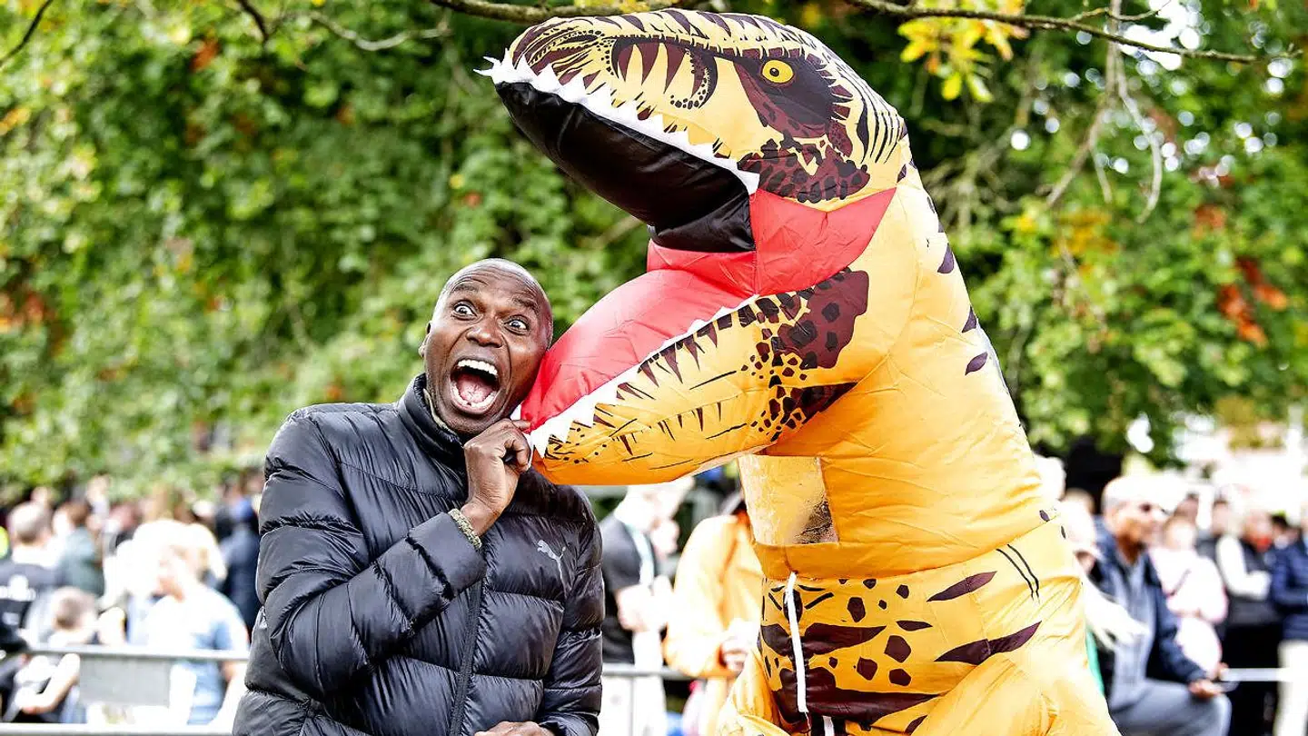 Lars Holm, Frederiksberg, var klædt ud som en dinosaur og samlede penge ind til Kræftens Bekæmpelse. »Mange ude på ruten lovede, at de ville støtte sagen, når de kommer i mål. Kan jeg samle nogle tusinde kroner ind, er jeg lykkelig,« siger han. I målet lovede Wilson Kipketer den sveddryppende eremitageløber, at han vil støtte den gode sag.