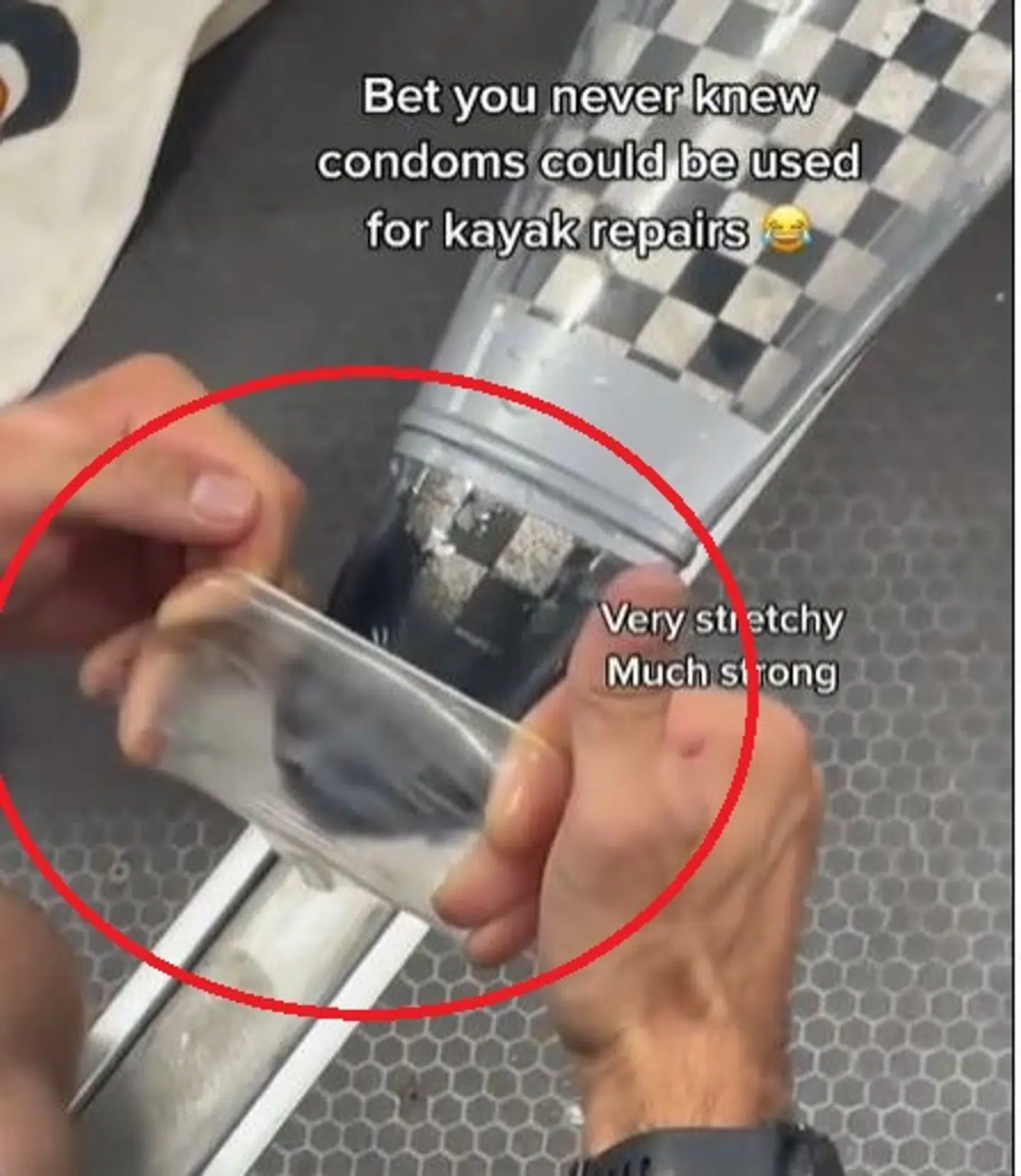 På Instagram afslører hun, at et kondom kan spille en afgørende rolle i processen. Her kan man se, hvordan kondomet bruges til at reparere hendes kajak.