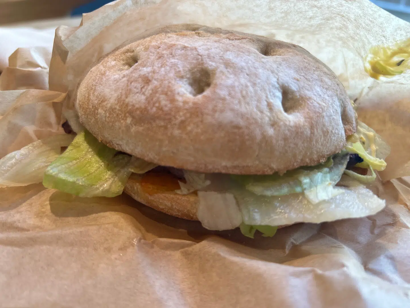 Da jeg tager den første bid, er der endnu mere salat, som flygter væk fra at blive spist. Til sidst ender det med at det meste af salaten har forladt burgeren.