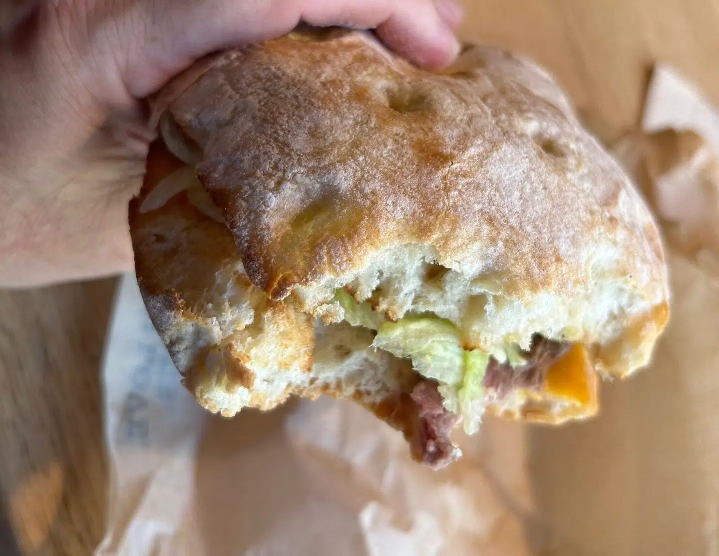 Første bid smager ikke af ret meget. Det smager mest af brød og den smeltede cheddarost.