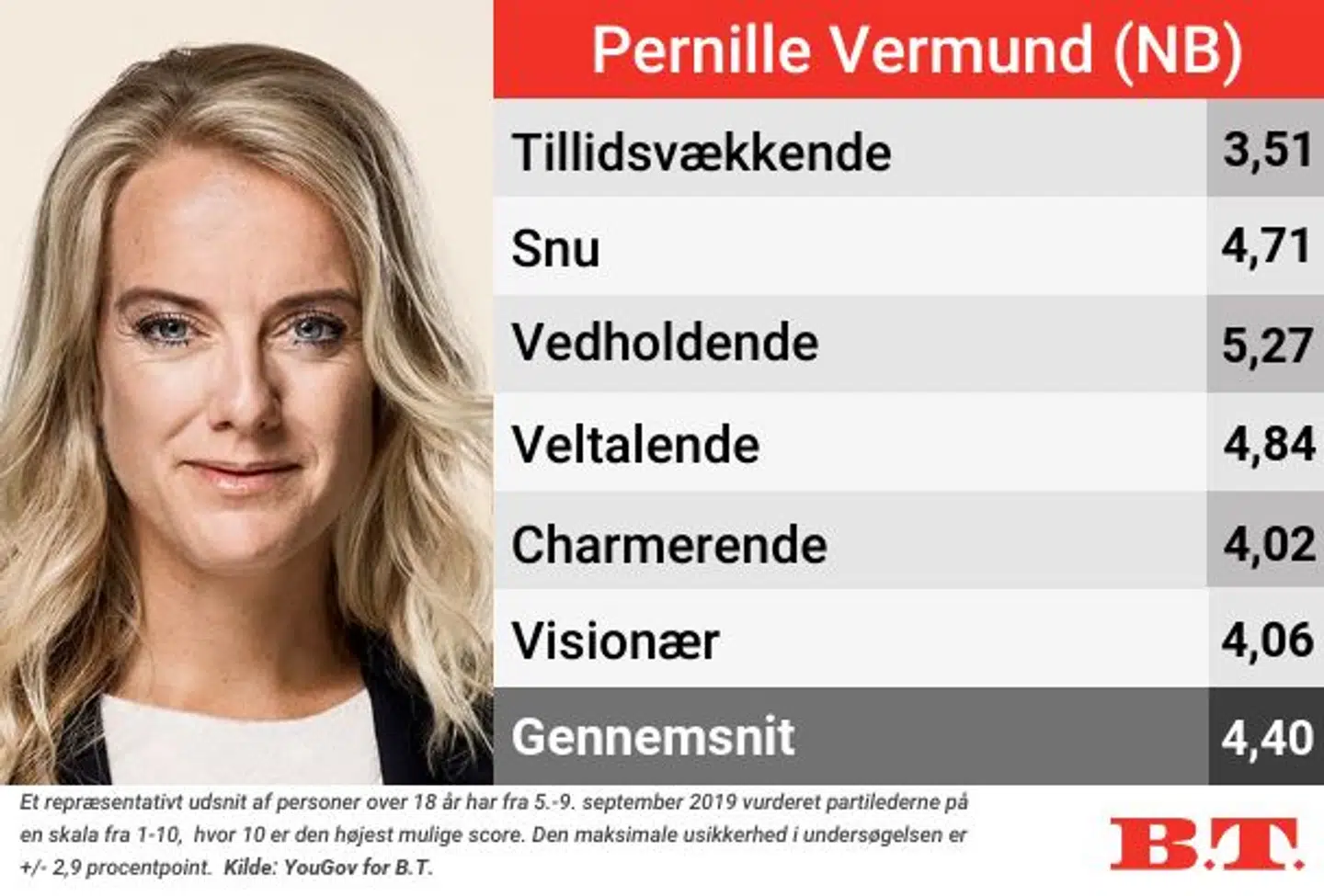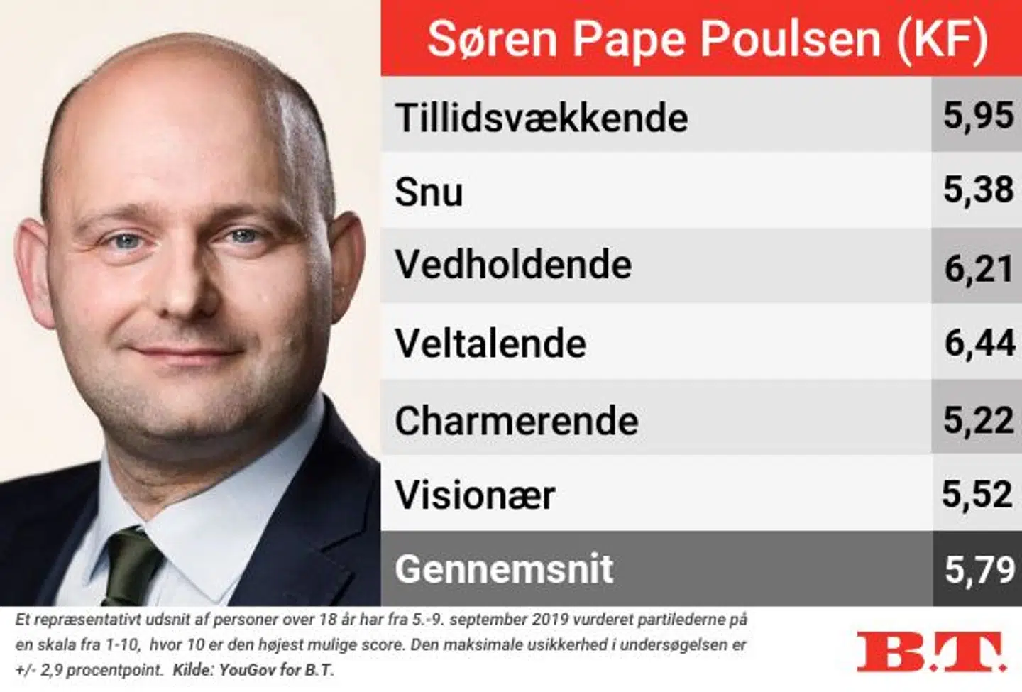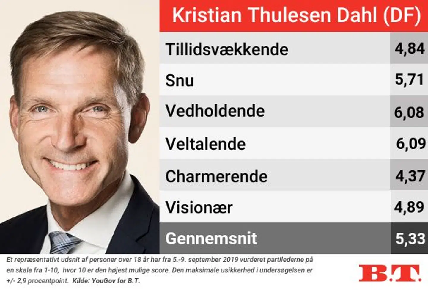 Hos danskerne ligger han nederst i alle kategorier med undtagelse af snu og vedholden. Her scorer han flere point end Uffe Elbæk.