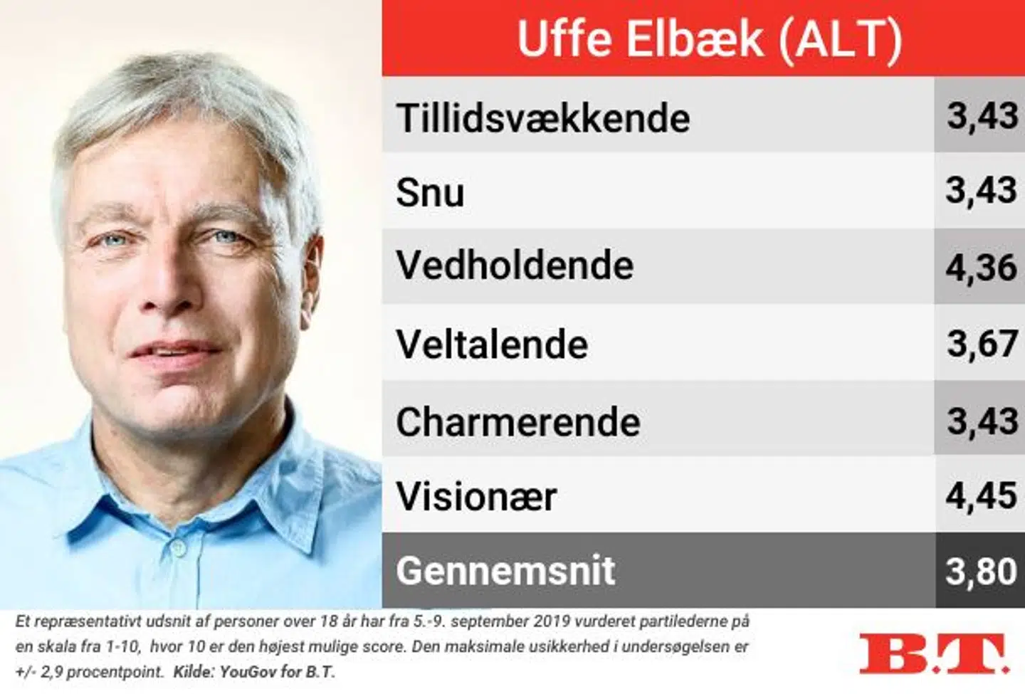 Helt i bunden af undersøgelsen ligger Uffe Elbæk (ALT).