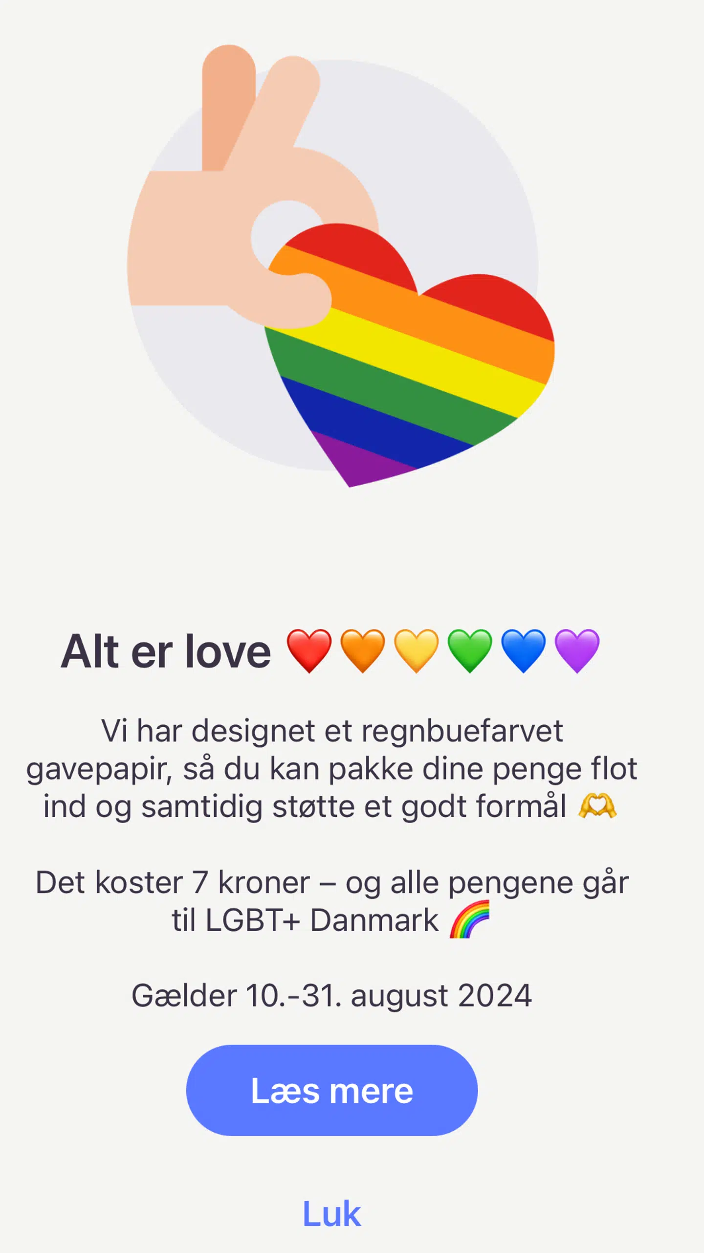 »Hos MobilePay har vi valgt at markere Pride-ugen ved at give brugerne mulighed for at tilkøbe et særligt gavepapir med regnbuefarver, når de sender et beløb. Det beløb, der kommer ind fra dette gavepapir, sender vi videre til LGBT+ Danmark. Gavepapiret i regnbuefarver er et tilbud, der kan tilvælges, hvis brugerne ønsker det. MobilePay donerer ikke selv penge,« lyder det fra pressechefen, der tilføjer: