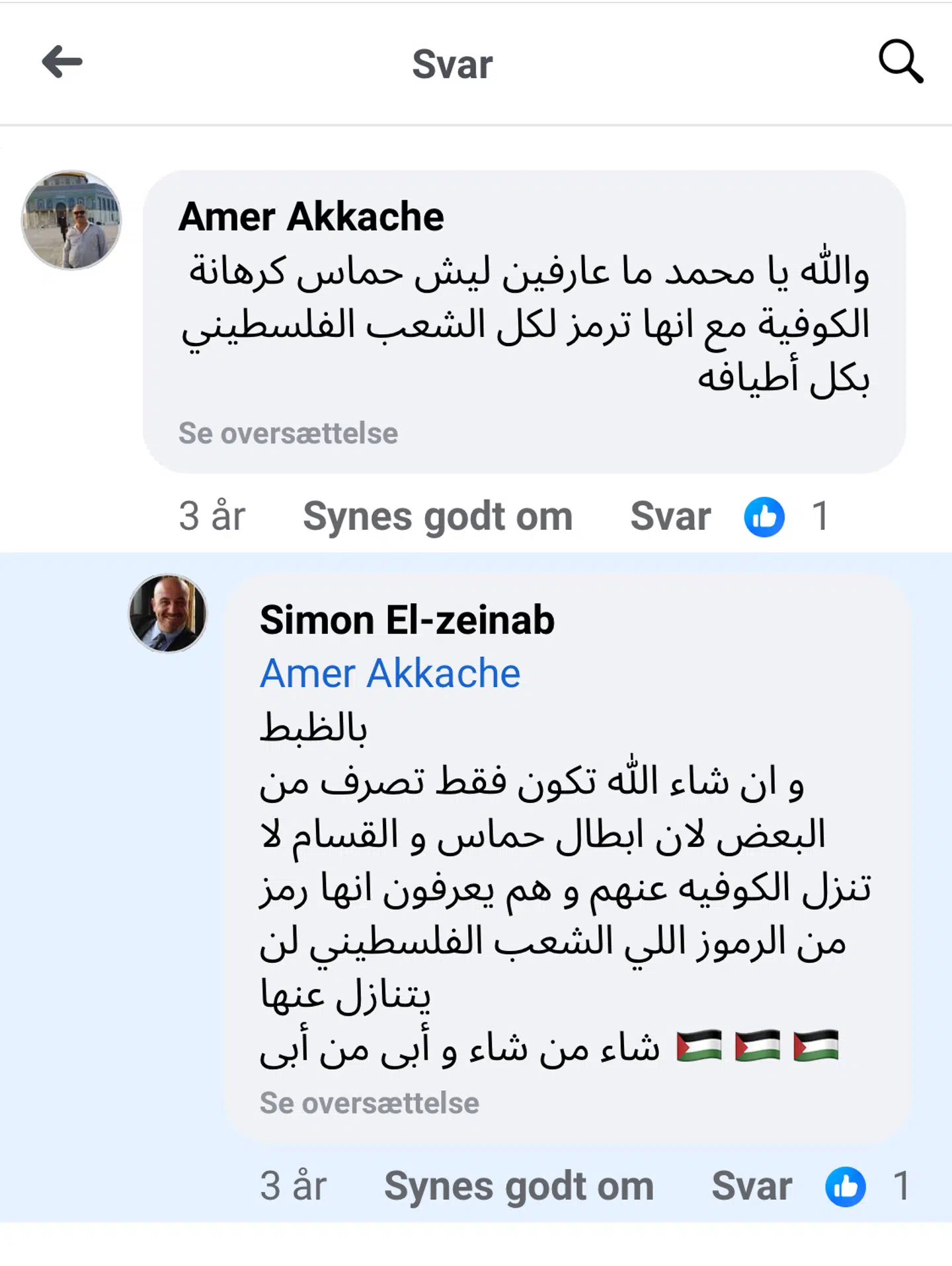 »Nemlig. Og hvis Gud vil, vil det kun være et træk fra nogle menneskers side, fordi heltene fra Hamas og Al-Qassam fjerner ikke keffiyeh fra dem, og de ved, at det er et af symbolerne på, at det palæstinensiske folk ikke vil give op. Hvem der vil, og hvem der nægter, hvem vil.«