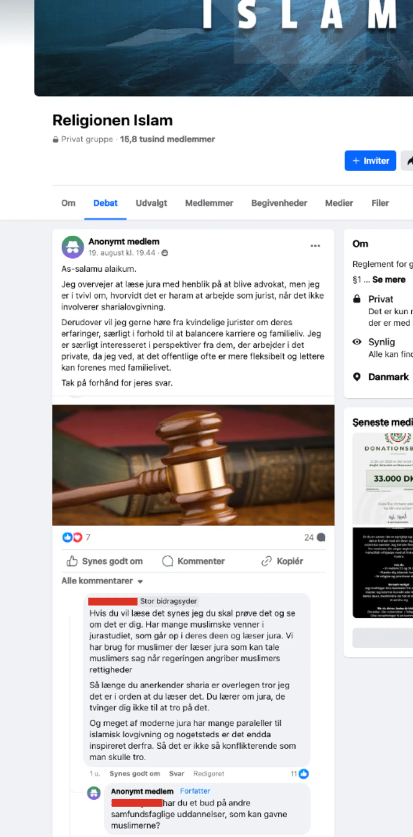 Et eksempel på dette kommer fra en person, der i gruppen 'Religionen Islam' spørger, om det mon er i orden for en muslim at læse jura.