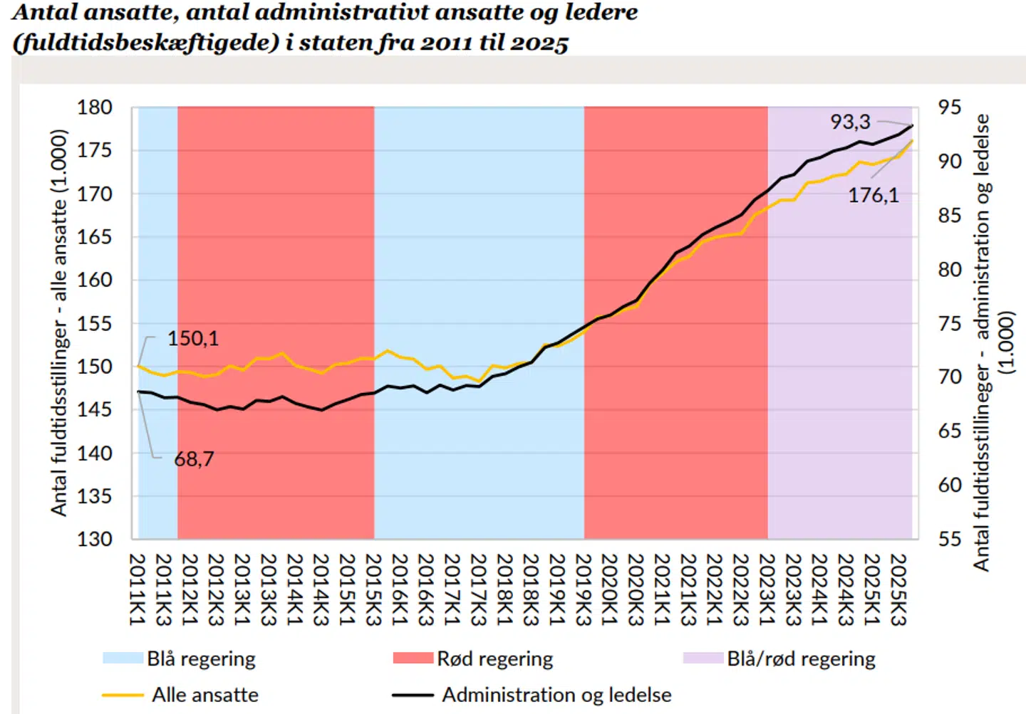 Alene i løbet af 2025 er antallet af ledere og administratorer i staten steget med 1.503 fuldtidsbeskæftigede. Dermed har regeringen altså heller ikke nået sin egen målsætning om, at der skulle fjernes 1.000 administrative stillinger i staten i 2025.