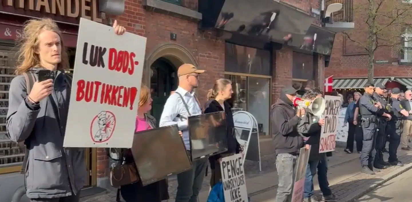 Her foregår i skrivende stund en demonstration fra aktivistgruppen 'Amager imod slagtere,' der står på den modsatte side af gaden om kommer med tilråb mod slagteren og dets kunder.