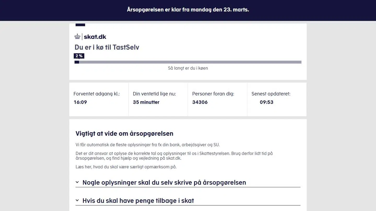 Allerede fredag eftermiddag 16.45 var der nemlig 76.653 personer der sad i en mere end en times lang kø på 'skat.dk'.