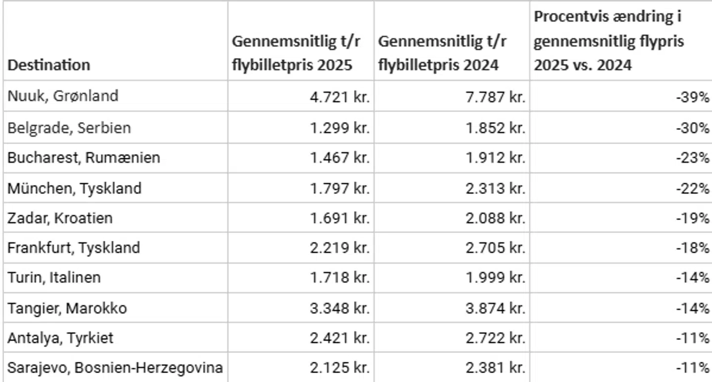 Se de destinationer, hvor flyrejsen tur/retur er faldet allermest i pris i forhold til sidste år herunder.