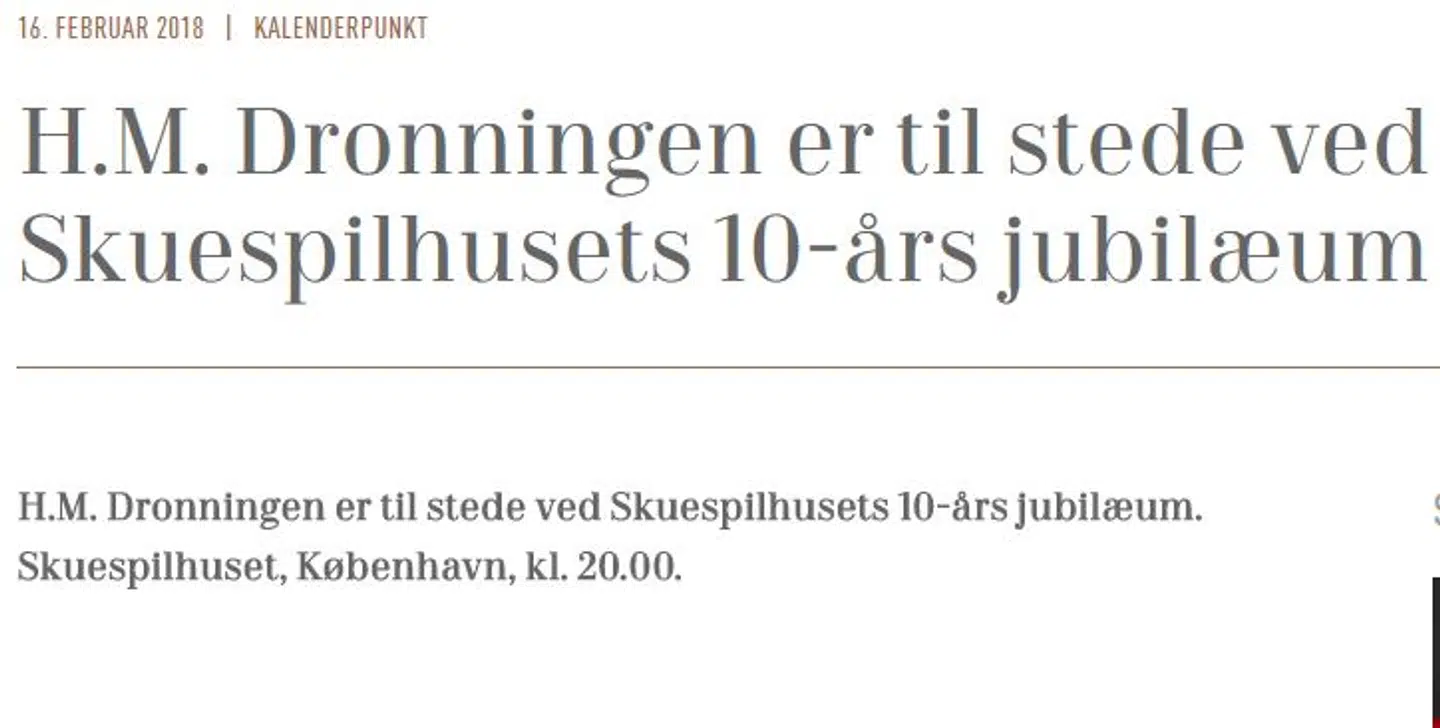 På fredag skulle Hendes Majestæt have deltaget i Skuespilhusets 10-års jubilæum kl. 20 i Skuespilhuset i København. Samtidig skulle hun have afholdt en offentligt audiens mandag 19. februar kl. 10 på Christiansborg Slot.
