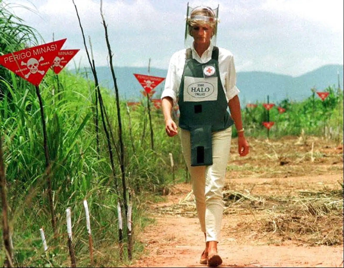 Her blev hun i januar 1997 fotograferet med visir og beskyttelsesvest, mens hun gik gennem et område, der var ryddet for miner.