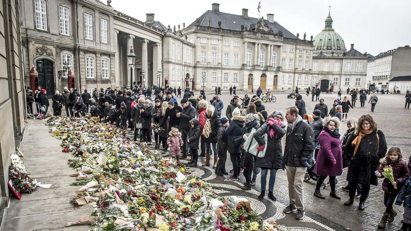 Blomsterne, hilsnerne og de tændte lys fra medfølende danskere var på få timer vokset til at dække alle de fire brede trappetrin, som fører op til palæet. Midt i havet havde 10-årige Christine lagt en håndskreven hilsen.