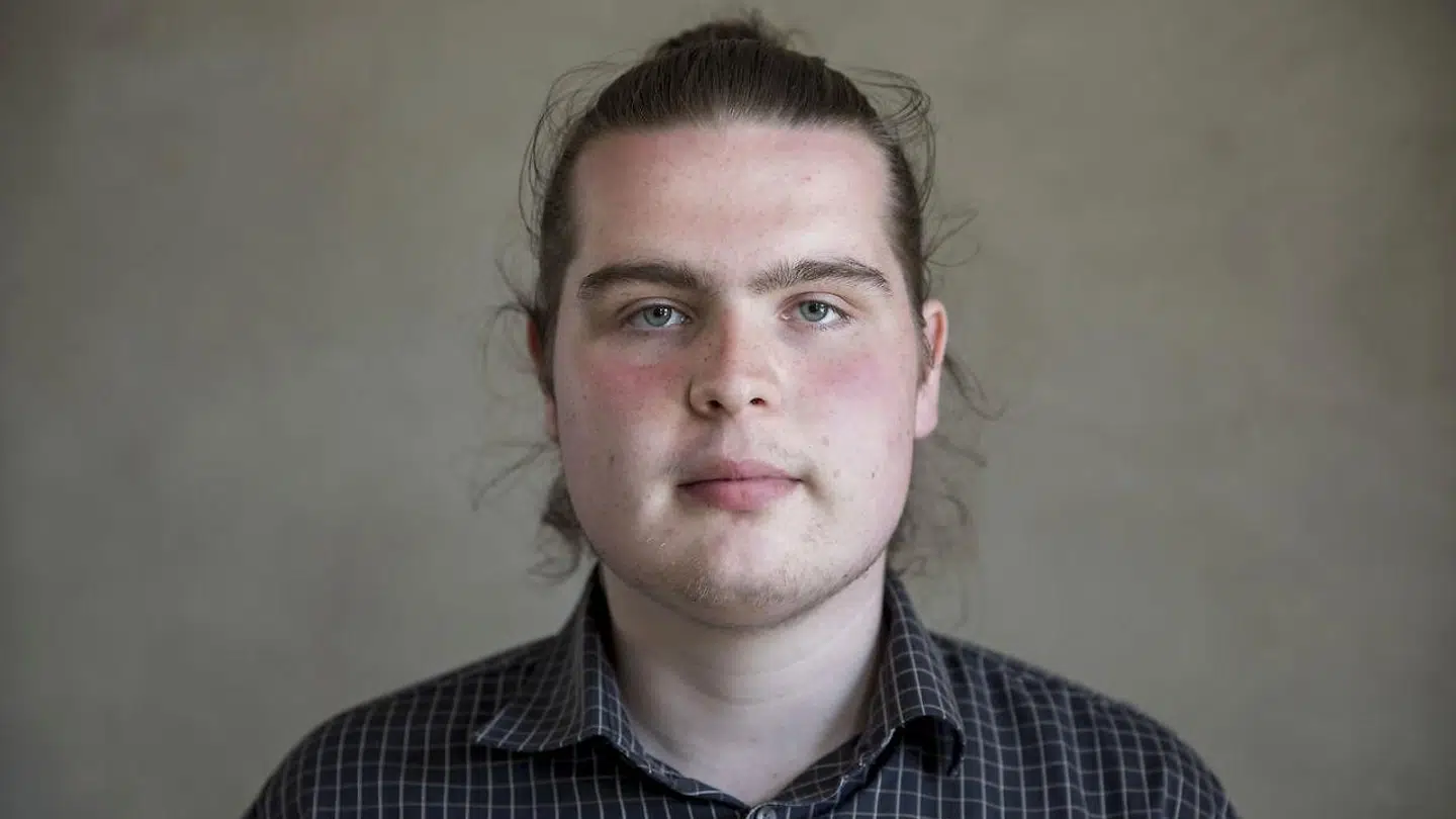 Med grønne klipklapper og langt hår står Rasmus Madsen i skarp kontrast til den 38-årige politiker, der er klædt i jakkesæt og blanke sko.