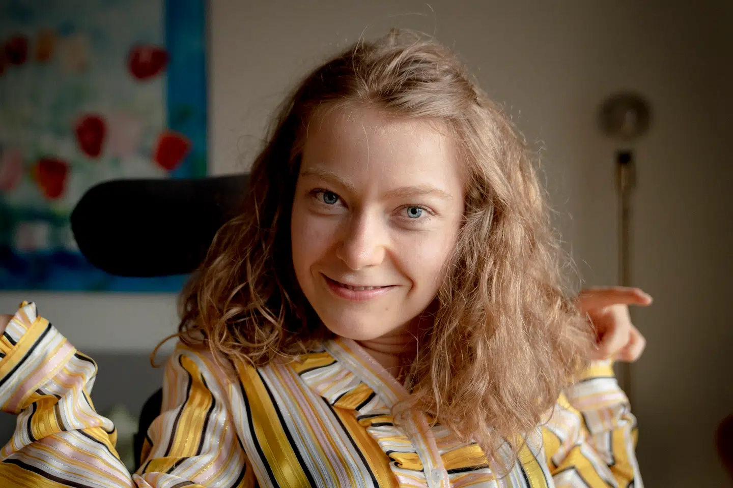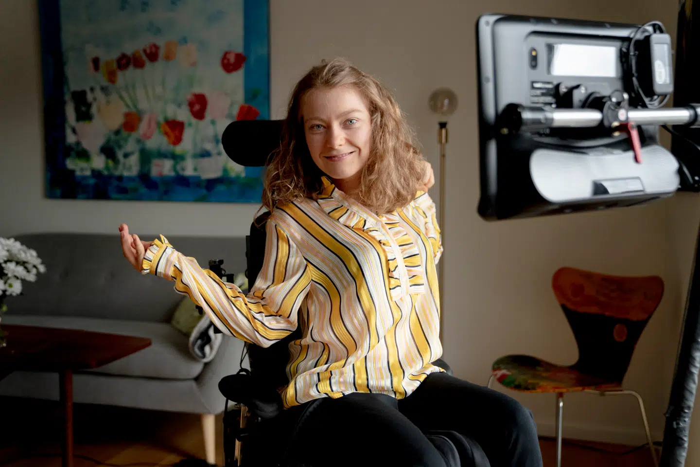 Hendes hænder og arme spræller i spastiske bevægelser, som får kørestolen til at knirke og knage. Imidlertid er hendes øjne fokuserede og upåvirkede af handicappet.