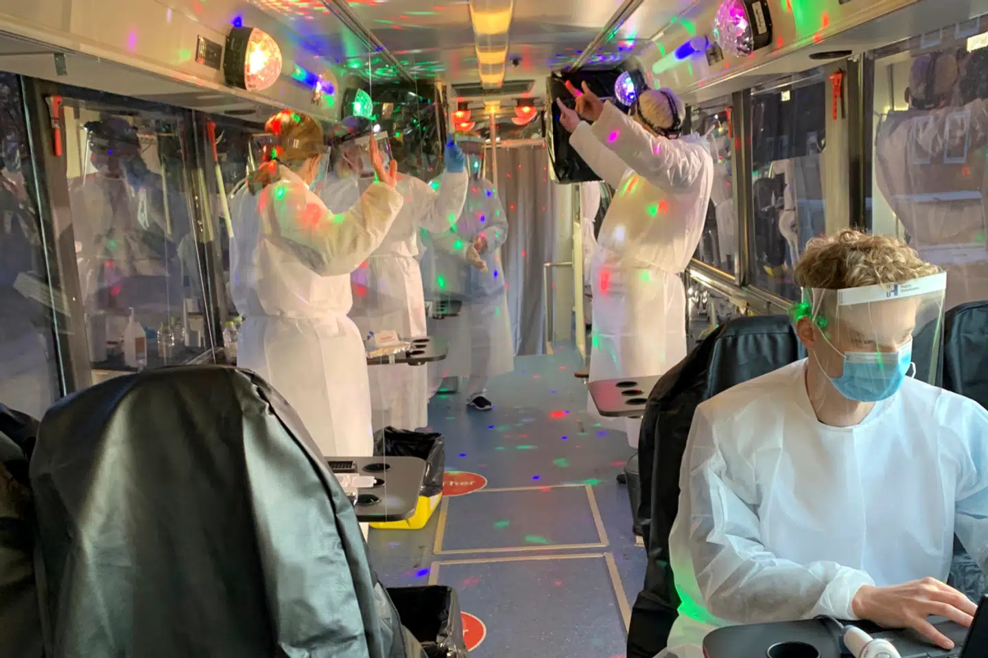 I intet mindre end en partybus står personale klar med visir og podningsudstyr – og diskokuglen og musikken er tændt.