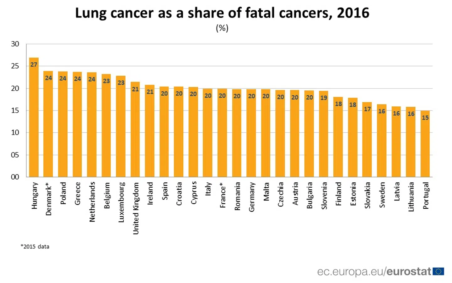 Dermed ligger Danmark helt i toppen af listen over den uhyggelige kræftstatistik - kun overgået af Ungarn, hvor 27 procent af kræftrelaterede dødsfald i 2016 skyldtes lungekræft.