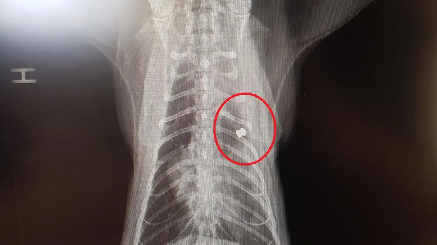 Amigos krop var fyldt med hagl. 24 hagl for at være helt præcis. Rikke Fjordbak Ravn forklarer, at familien – ligesom dyrlægen – var meget forundret over billederne. De havde aldrig set noget på katten, der indikerede, at den var fyldt med hagl.