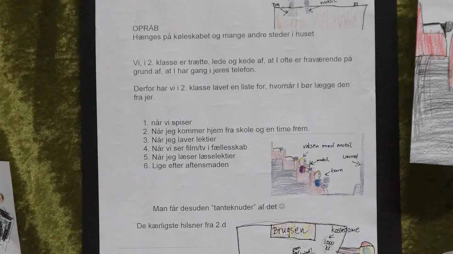 En 2. klasse i Kolding kan næsten alle mærke konsekvenserne af, at deres forældre stirrer ned i telefonerne i tide og utide. Derfor har de opsat seks simple regler for mobilbrug. Ekspert hylder tiltaget.