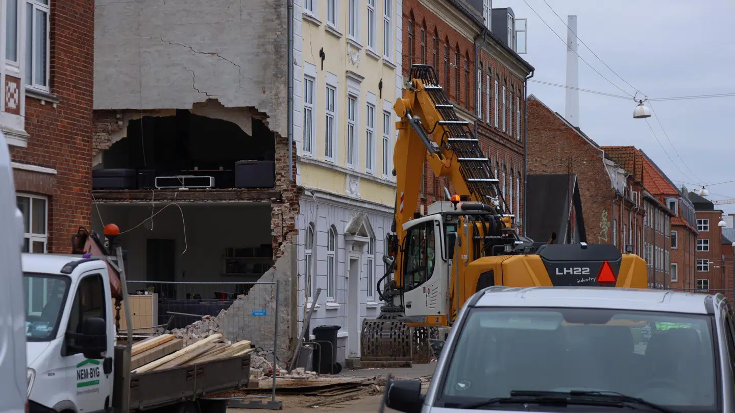Mathilde Husted Vinkel var sikker på, at hun ikke ville nå ud i tide, men alle i bygningen nåede det heldigvis uden at komme til skade. Gavlen for enden af den gule bygning var dog ikke til redde. Den var styrtet sammen og havde dannet frit udsyn til lejlighederne i Østergade.