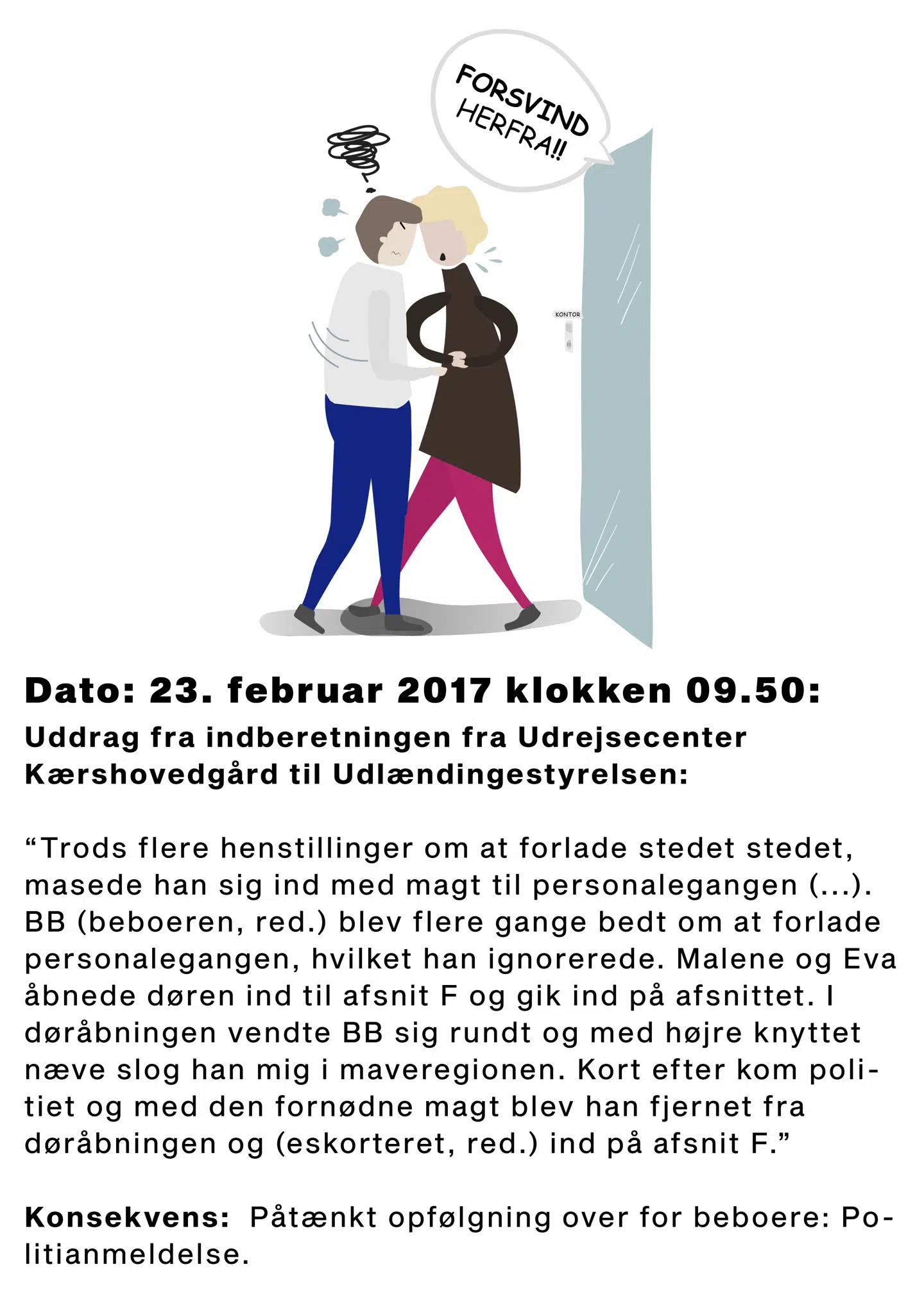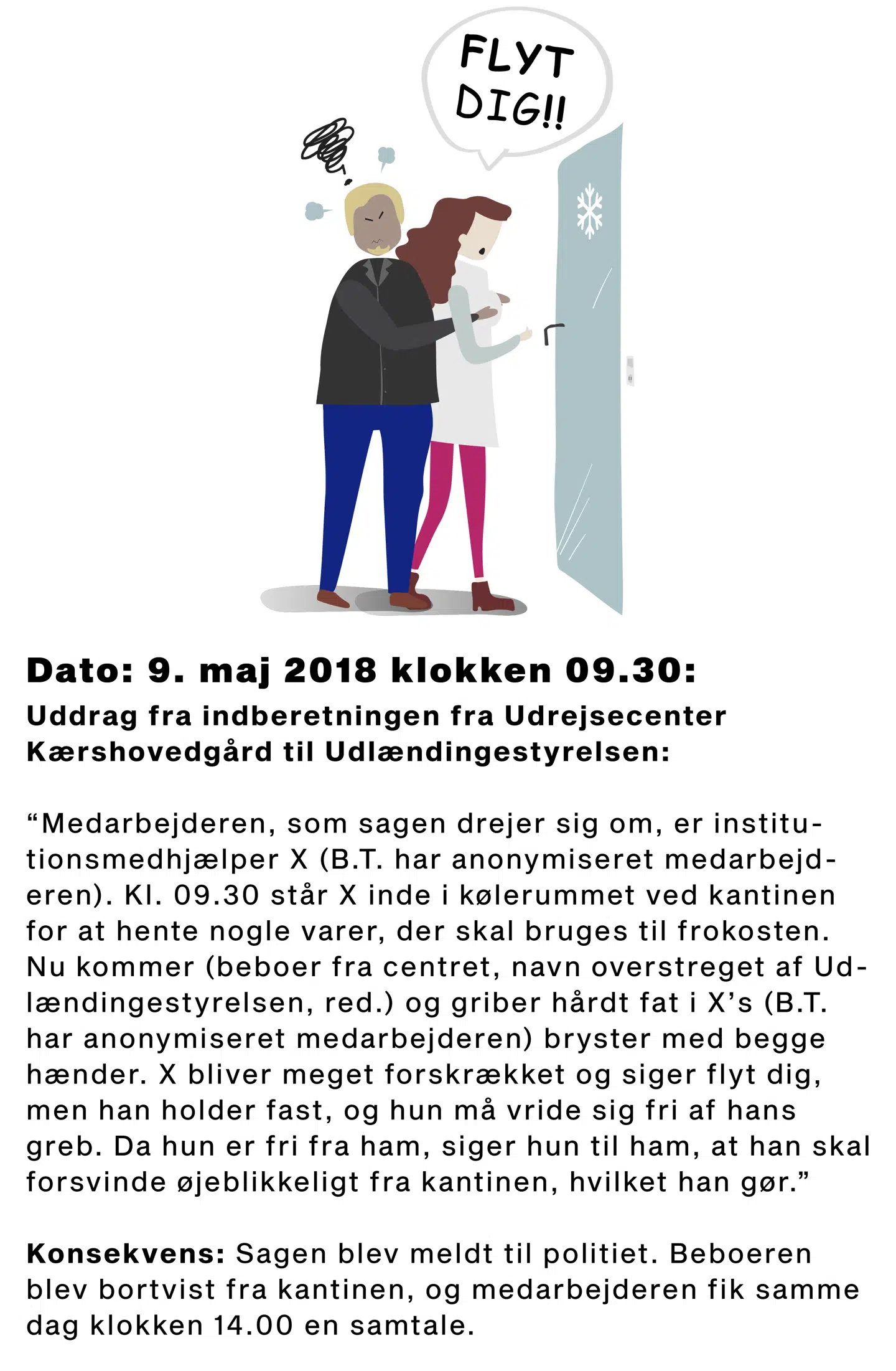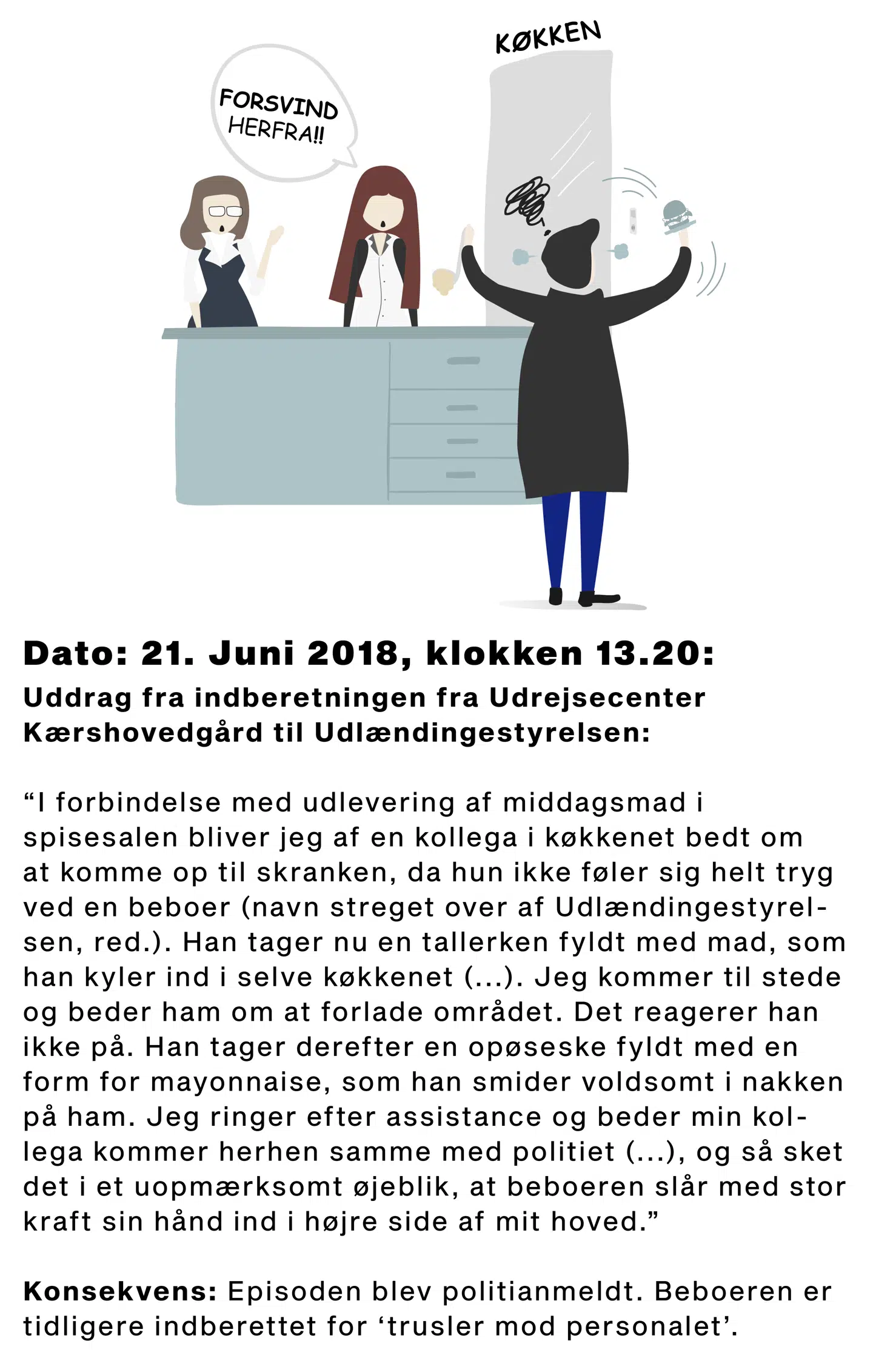 Klokken 9.30 den 9. maj 2018 år befandt en kvindelig medarbejder på Kærshovedgård sig inde i kølerummet ved centrets kantine. En beboer fra centret trængte sig ind på hende bagfra og greb hårdt fat i hendes bryster - og holdt fast.
