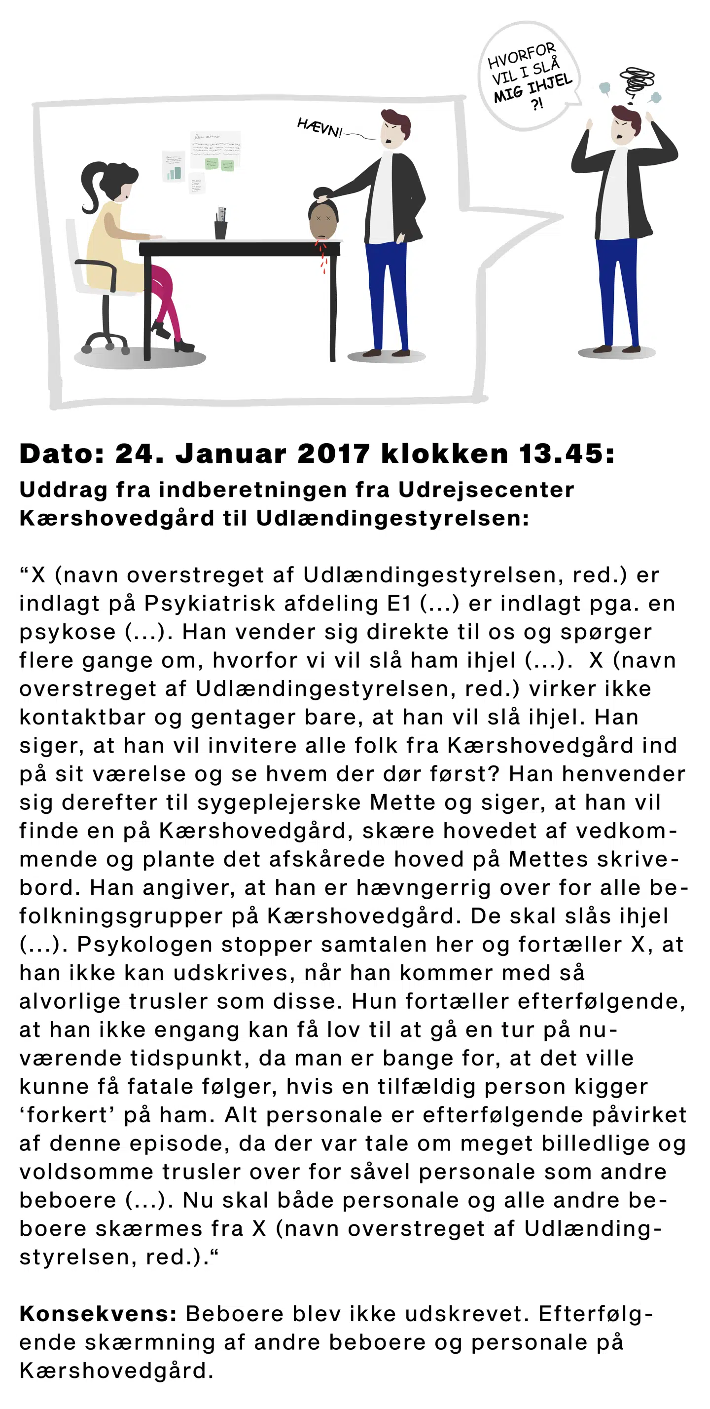 Af indberetningen til Udlændingestyrelsen fremgår det, at psykologen, der var med til udskrivningssamtalen den 24. januar 2017, vurderede, at han ikke kunne udskrives, da 'det ville kunne få fatale følger, hvis en tilfældig person kigger 'forkert' på ham'.