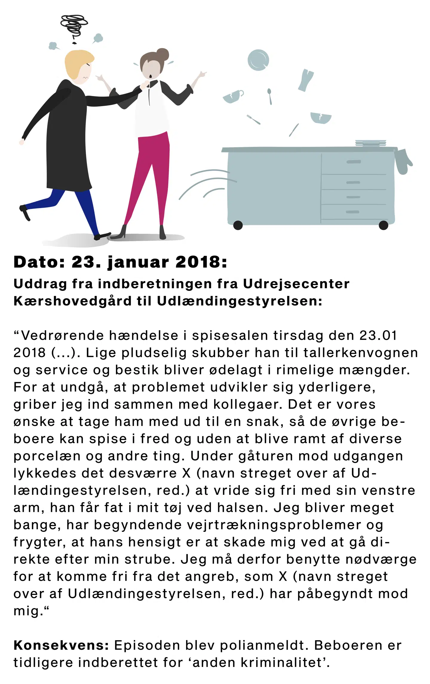 Den 23. januar 2018 blev en medarbejder angrebet af en beboer i centerets kantine. Beboeren greb fat om medarbejderens tøj ved halsen. Medarbejderen fik vejrtrækningsproblemner.