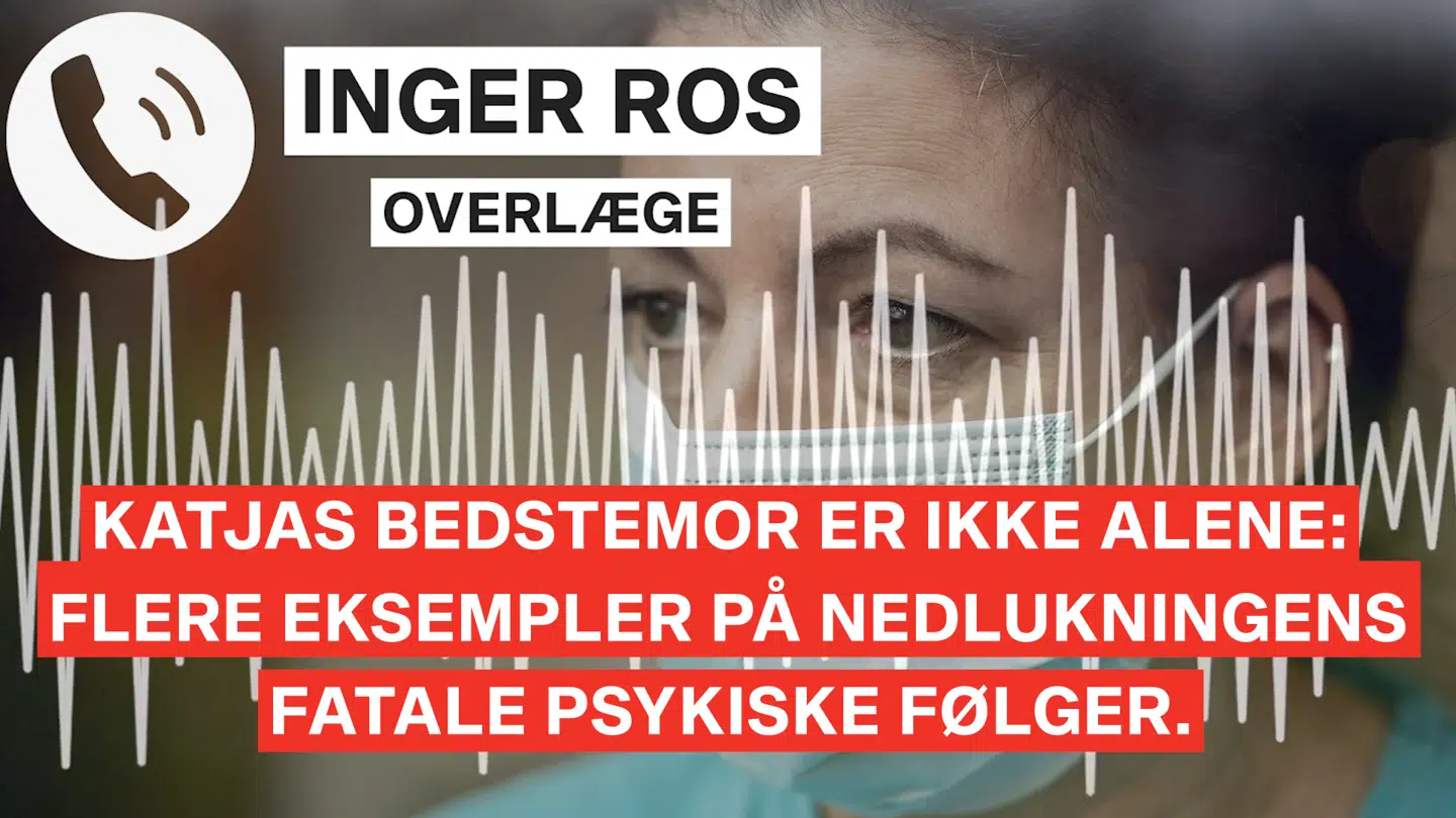 »Det gennemgående tema er ensomhed og selvmordstanker. Det er de ting, der bliver affødt af de her problemer som konsekvenser af nedlukningen. Vi må bare konstatere, at det er et meget, meget voldsomt problem i vores patientgruppe,« sagde overlæge Inger Ros for nylig til B.T.