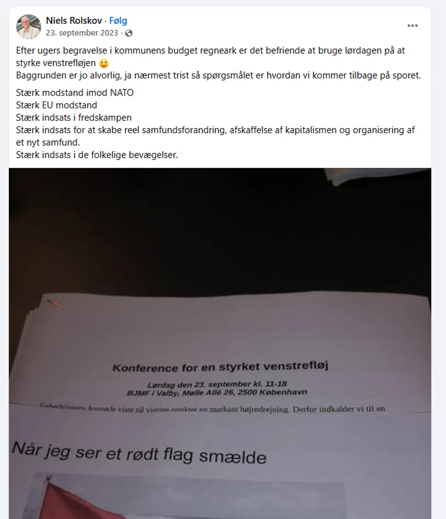 Men det er ikke den eneste gang, at Niels Rolskov har været på kant med partilinjen. I efteråret 2023 deltog han nemlig i en venstrefløjskonference, hvor blandt andet modstand mod EU og NATO var på dagsordenen.