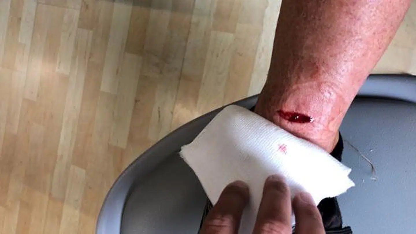 De mørkklædte drenge, som Lasse Leisner beskriver som indvandrerdrenge, svinger med kniven foran hans ansigt. Da han forsøger at parere, får han et dybt snitsår på hånden, der bløder voldsomt.