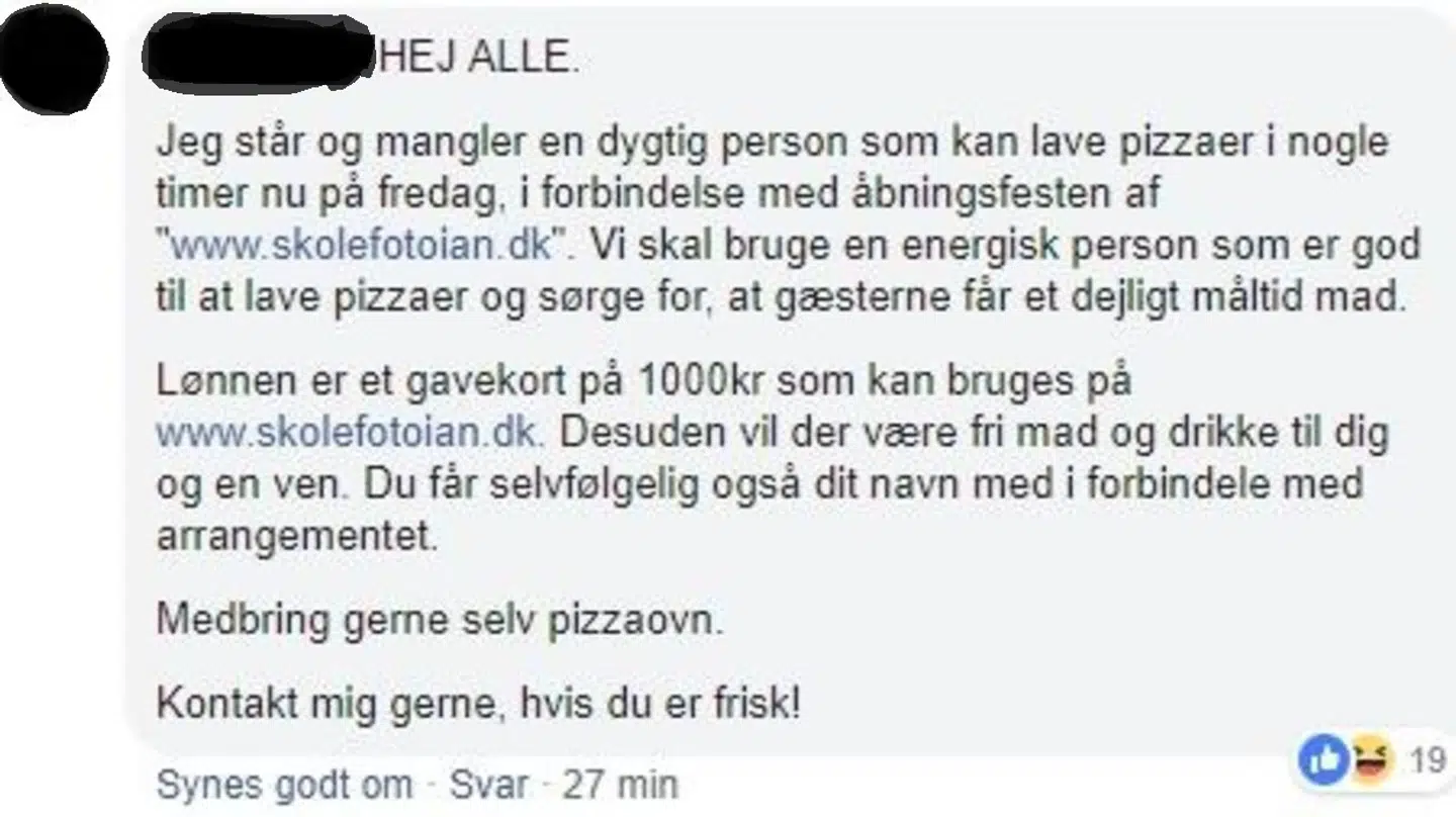 Her 'efterspørger' han en dygtig person, som kan lave pizzaer i nogle timer til et arrangement og medbringe egen ovn. Lønnen er et gavekort på 1000 kroner til hans fotowebshop og fri mad og drikke.