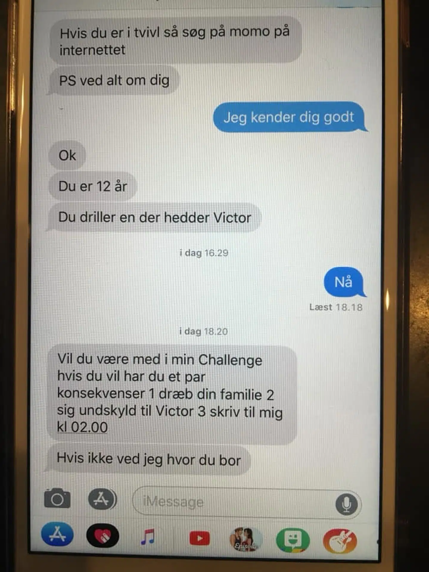 ‘Vil du være med i min challenge? Hvis du vil, har du et par konsekvenser. 1. Dræb din familie, 2. Sig undskyld til Victor, 3. Skriv til mig kl. 02.00. Hvis ikke, ved jeg, hvor du bor’.