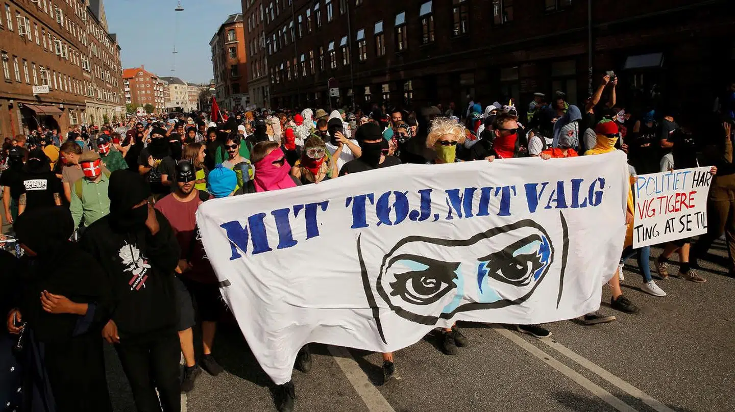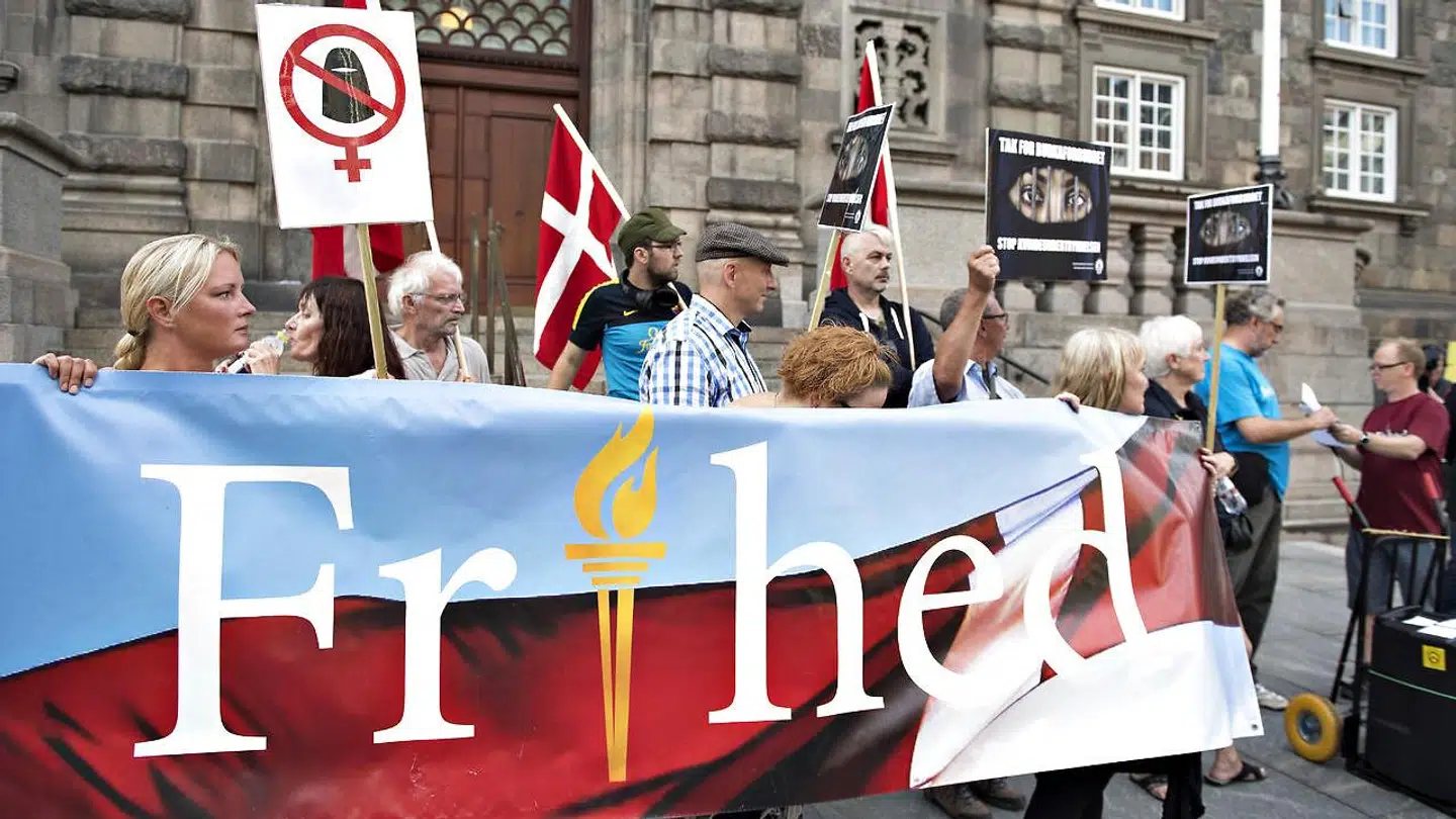 Den kontroversielle højrenationalistiske græsbevægelse For Frihed arrangerede en demonstration fra Israels Plads til Rigsdagsgården foran Christiansborg, hvor Dansk Folkepartis udlændingeordfører, Martin Henriksen, fik en erkendtlighed for sin kamp for forbuddet.