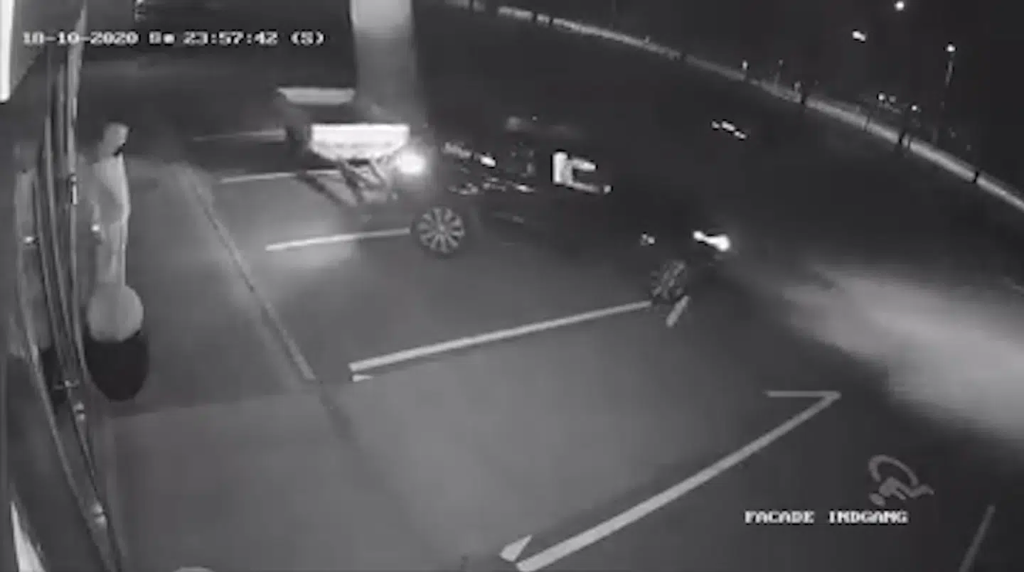 Kl. 23:54 søndag aften fangede Jørgensens overvågningskameraer to mænd i færd med at parkere en trailer foran hans forretning ved hjælp af en stjålet bil.