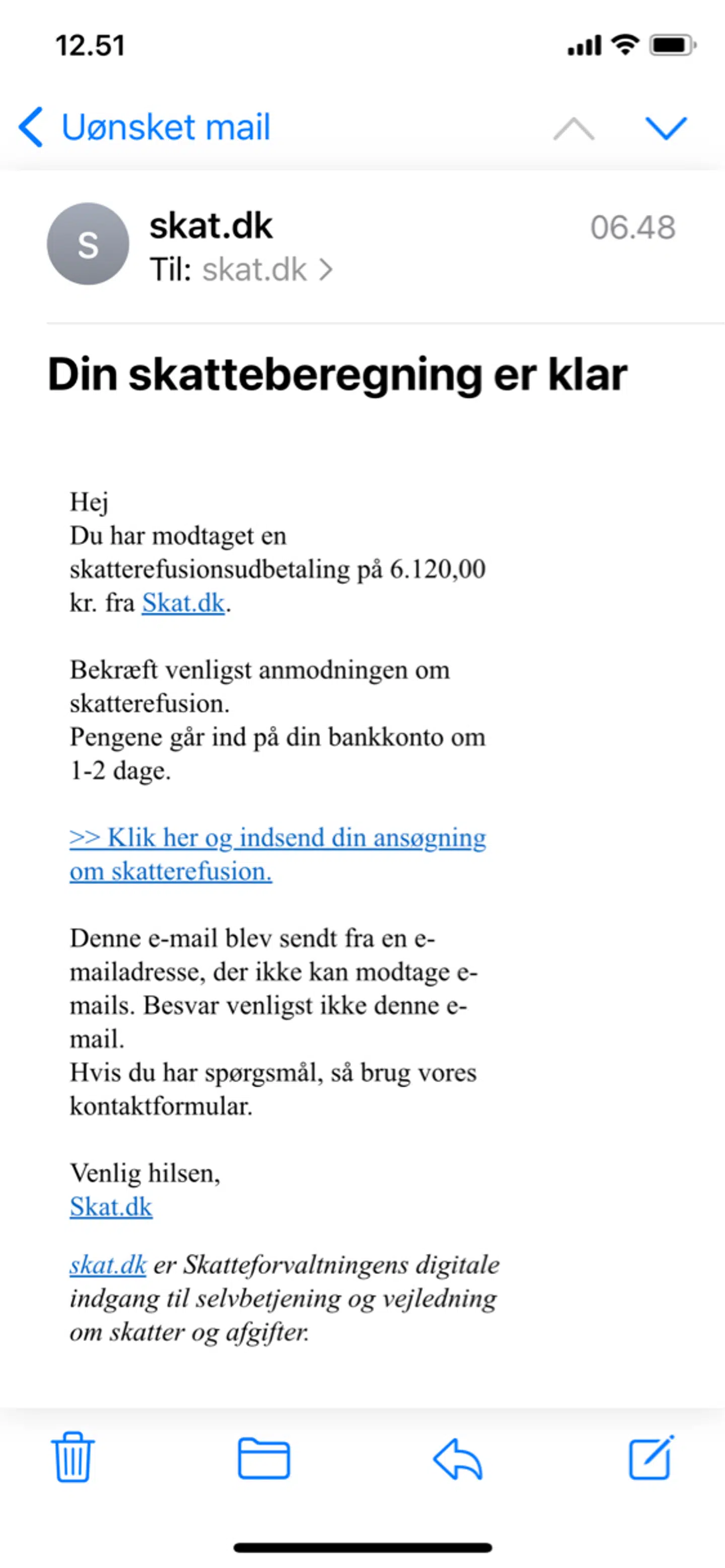 Sådan lyder det i starten af en mail, hvor det ligner, at den er blevet sendt fra Skattestyrelsen, og at den omhandler din skatteberegning.