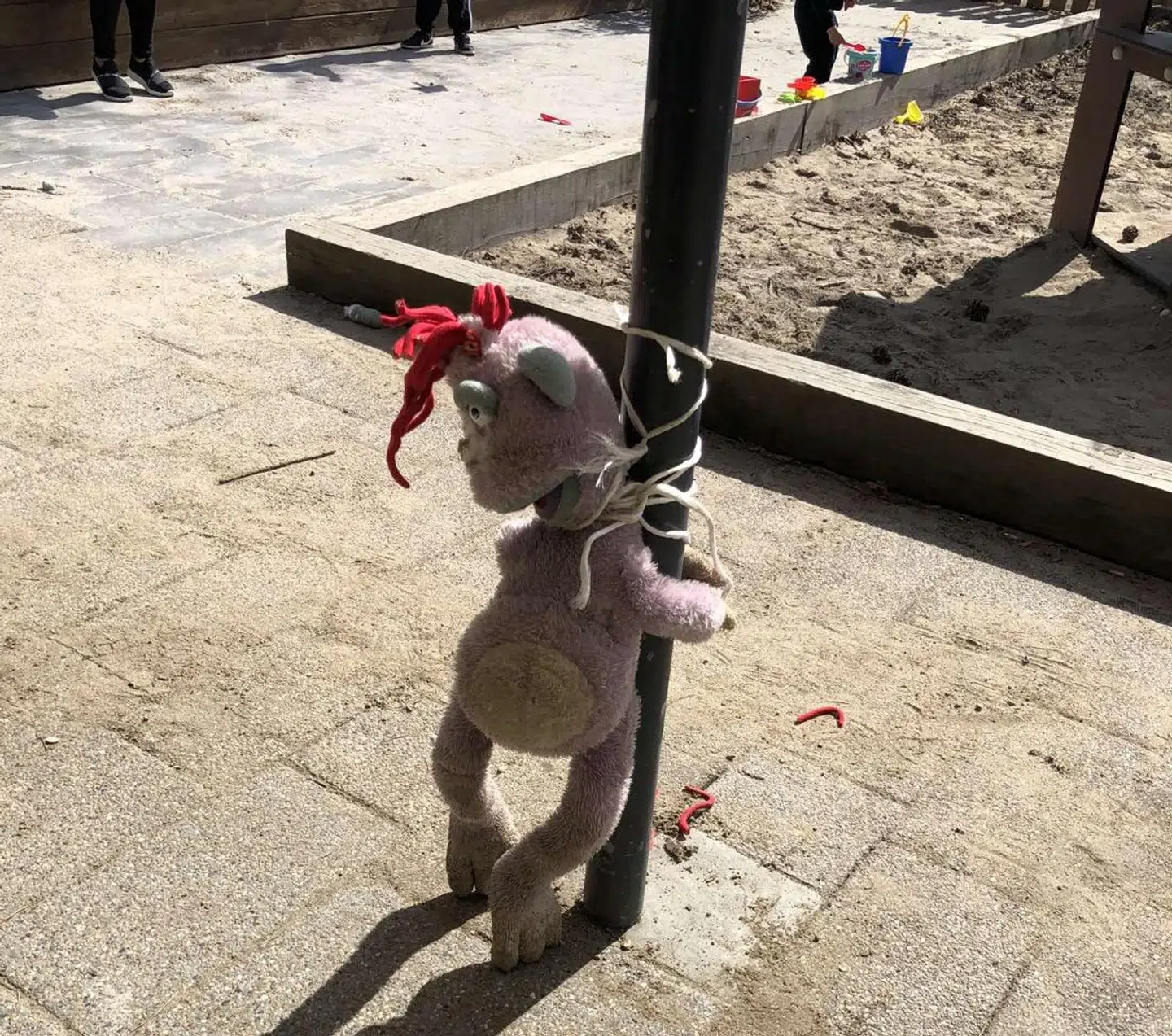 Nogen havde bundet en bamse fast til en stor pæl med et langt stykke hvidt reb. Bamsen var bundet hen over maven med armene ført om bag på ryggen.