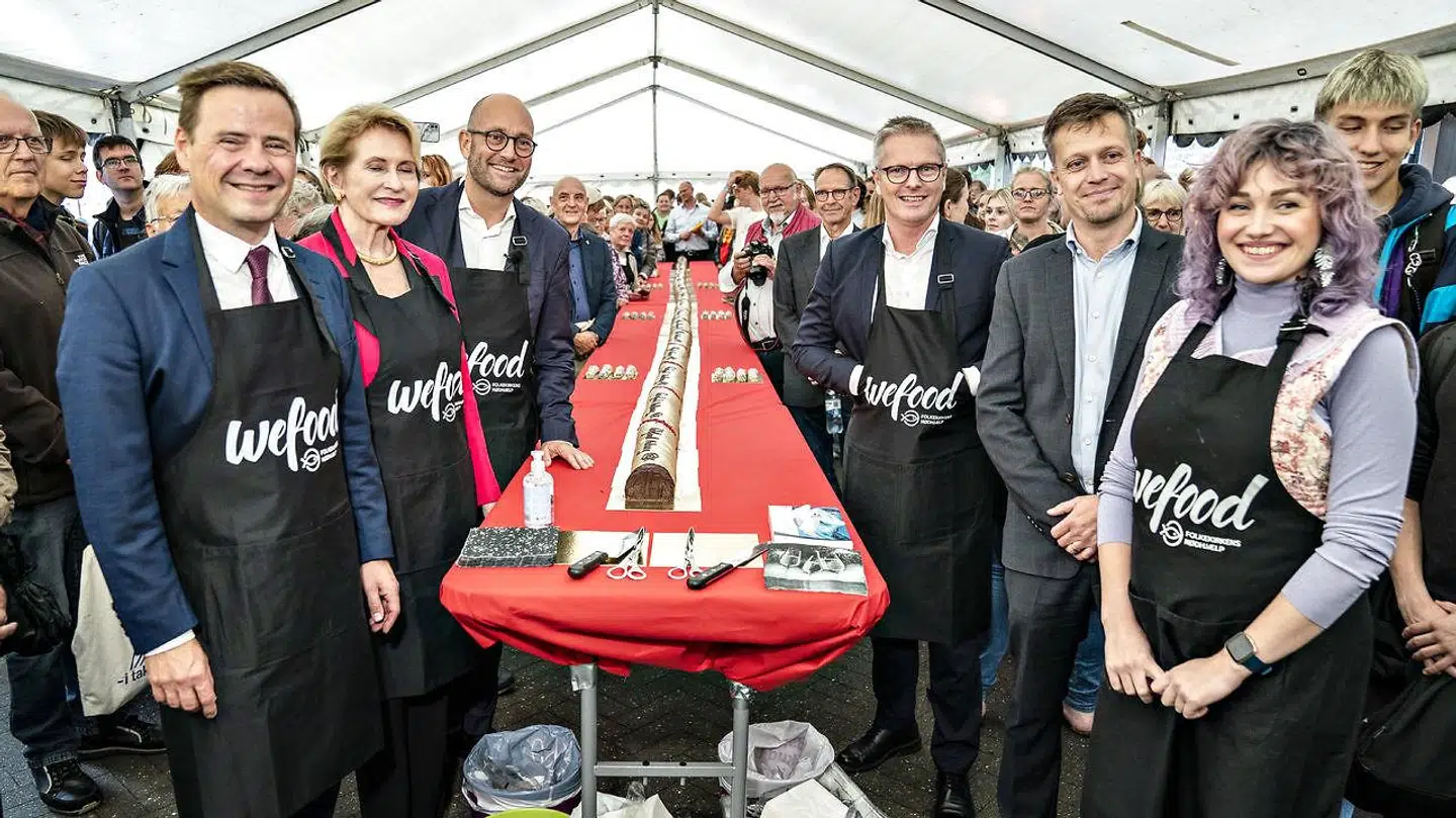 Til at skære og dele ud af kagen vil blandt andet fødevareminister Rasmus Prehn (S), udviklingsminister Flemming Møller Mortensen (S) og Karin Salling, næstformand for Købmand Herman Sallings Fond være til stede. Desuden står Aalborgs borgmester, Thomas Kastrup-Larsen (S) også klar til at dele ud af det, der forhåbentligt bliver verdens længste træstamme.