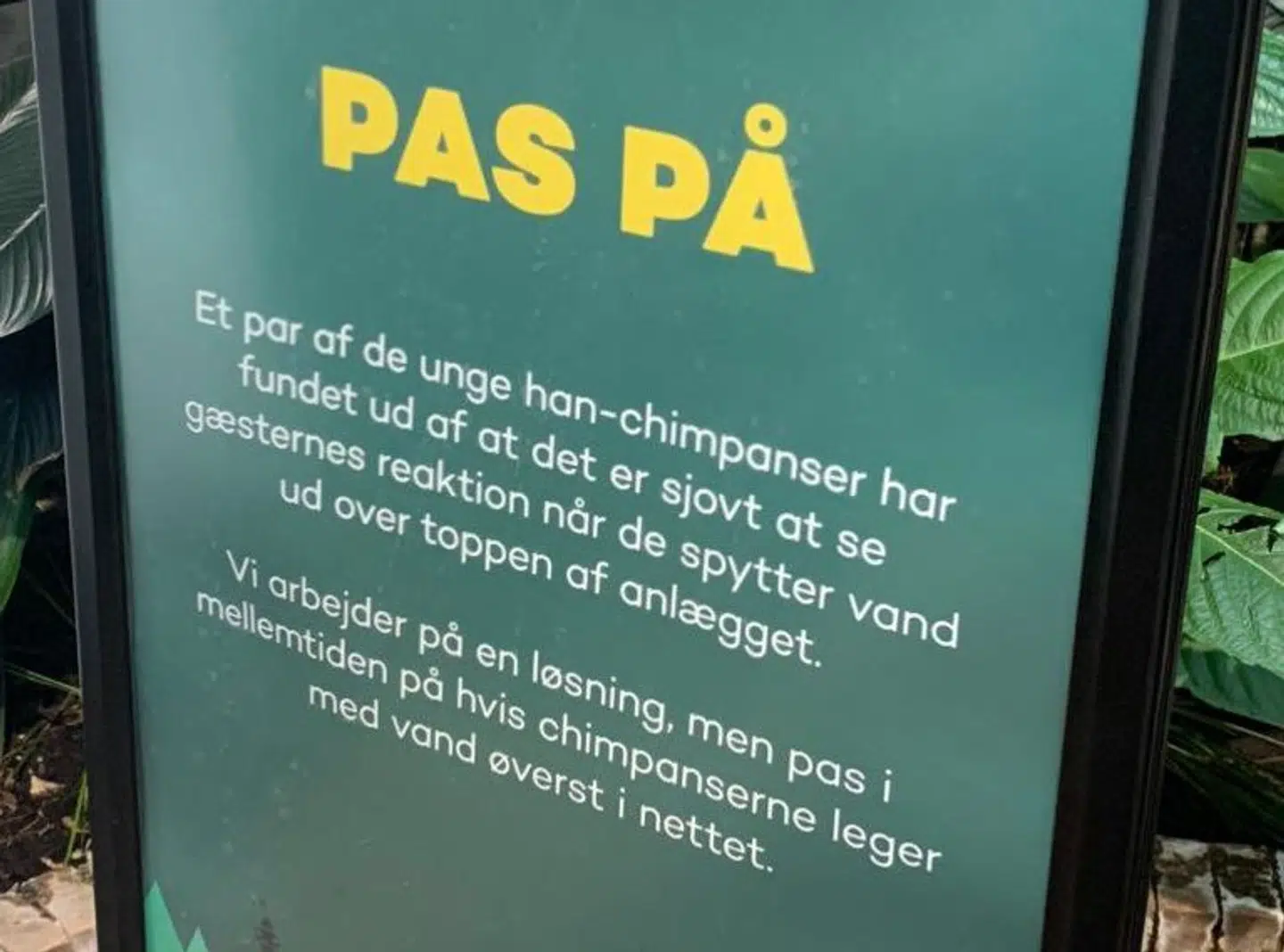 'Pas på. Et par af de unge han-chimpanser har fundet ud af, at det er sjovt at se gæsternes reaktion, når de spytter vand ud over toppen af anlægget.'