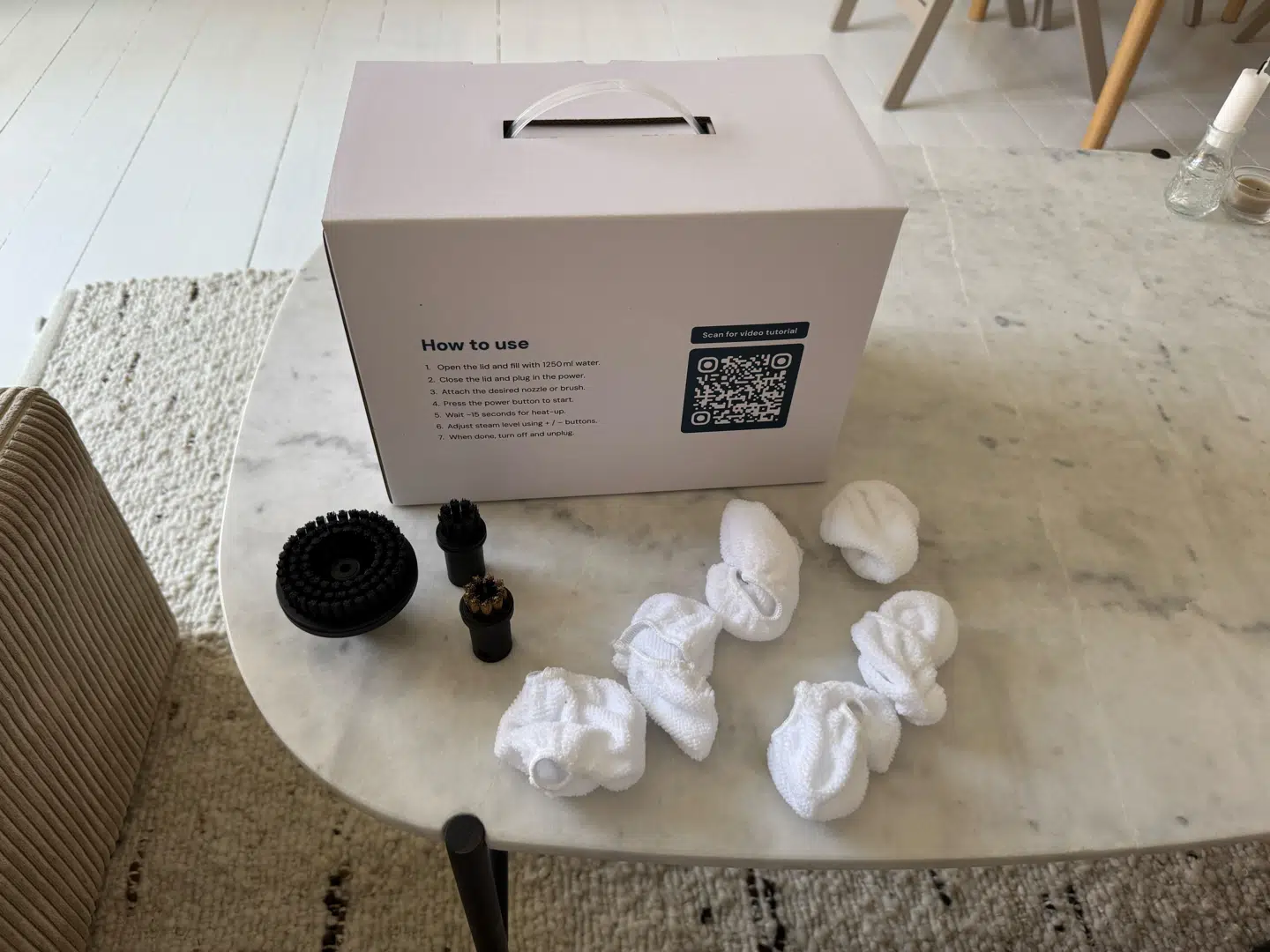 Leveringen af Rennoa SteamCleaner er hurtig og pakken kom allerede efter kun 2 dage. I kassen ligger selve damprenseren, som er kompakt og let, så den nemt kan tages med rundt i hjemmet.