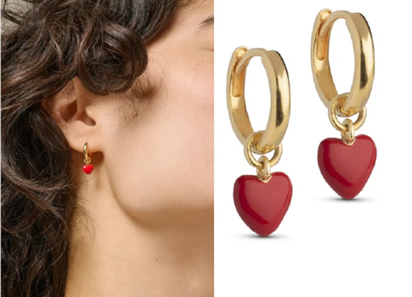 Søde Enamel Copenhagen øreringe med rød hjerte detalje. Øreringene er i sterling sølv belagt med 18k guld.