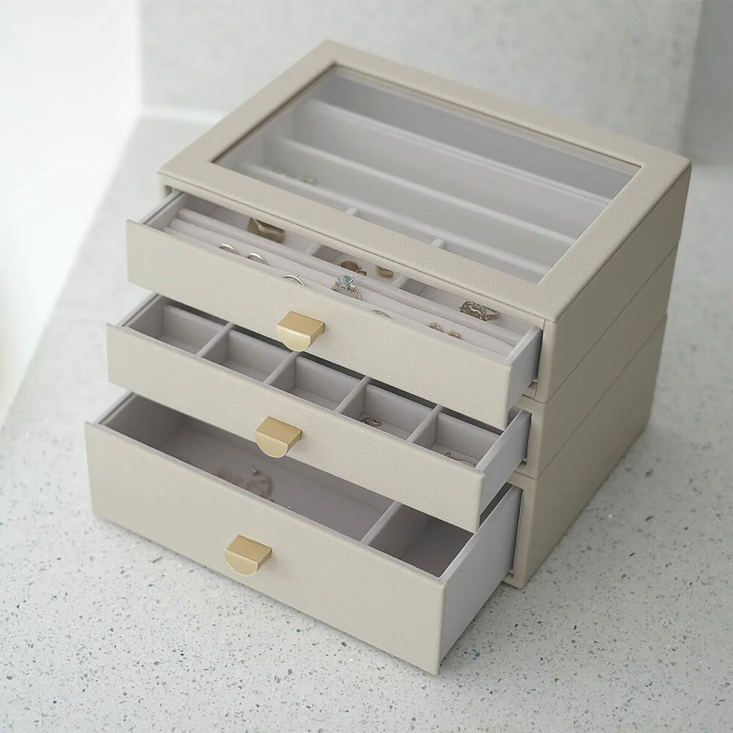 Den perfekte opbevaring til dine smykker - som samtidig udsmykker dit hjem. Dette smykkeskrin har et lækkert faux ydre, der giver det en eksklusiv følelse og tre skuffer, så du kan organisere dine fineste ejendele.