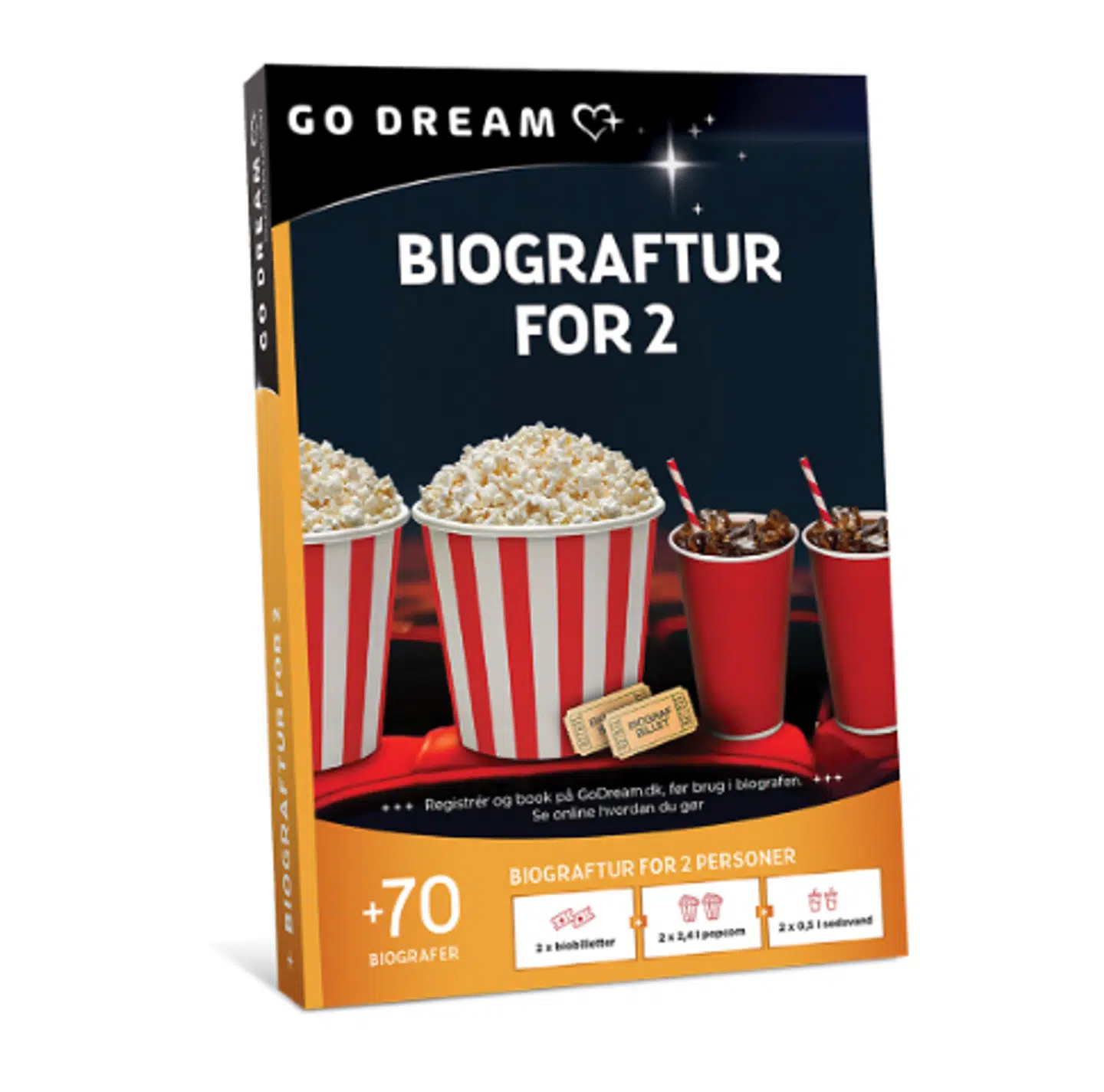 Giv en oplevelse i stedet for en ting: Med “Biograftur for 2” kan du give to biografbilletter — inklusive popcorn og sodavand — til to personer, klar til en hyggelig filmaften.
