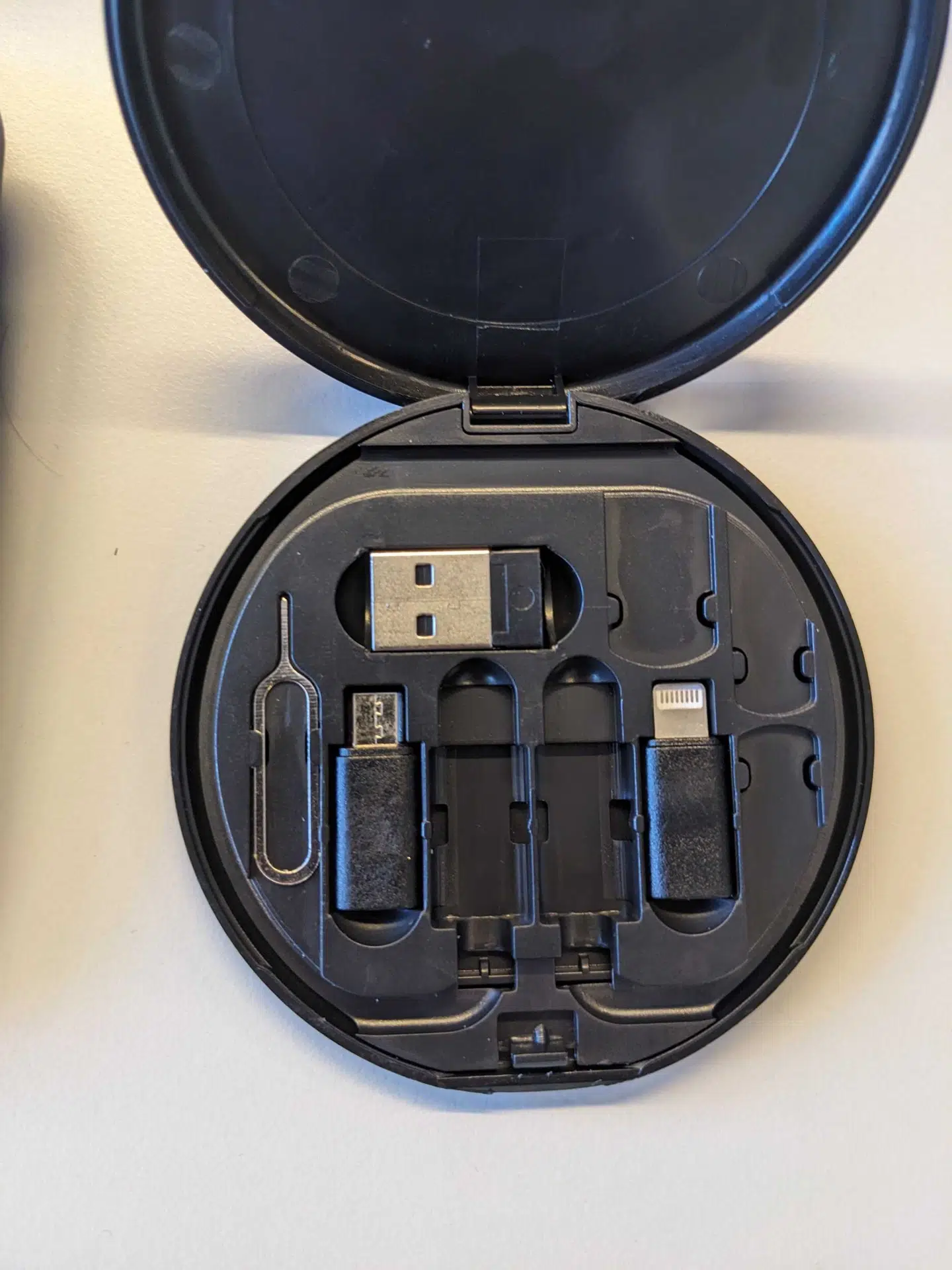 Kablet og adapterer hører hjemme i en lille sort plastikbeholder, specialdesignet til formålet. Ved første øjekast kan det ligne et makeupspejl, men når du åbner det, er der nøje gjort plads til det hele.
