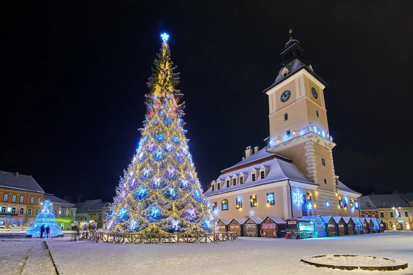 Hjertet af byen er den storslåede Rådhusplads, Piața Sfatului, hvor et charmerende julemarked afholdes i december. Pladsen domineres af den imponerende Sorte Kirke, den største gotiske kirke mellem Wien og Istanbul, hvis mørke sten står i dramatisk kontrast til den hvide sne.