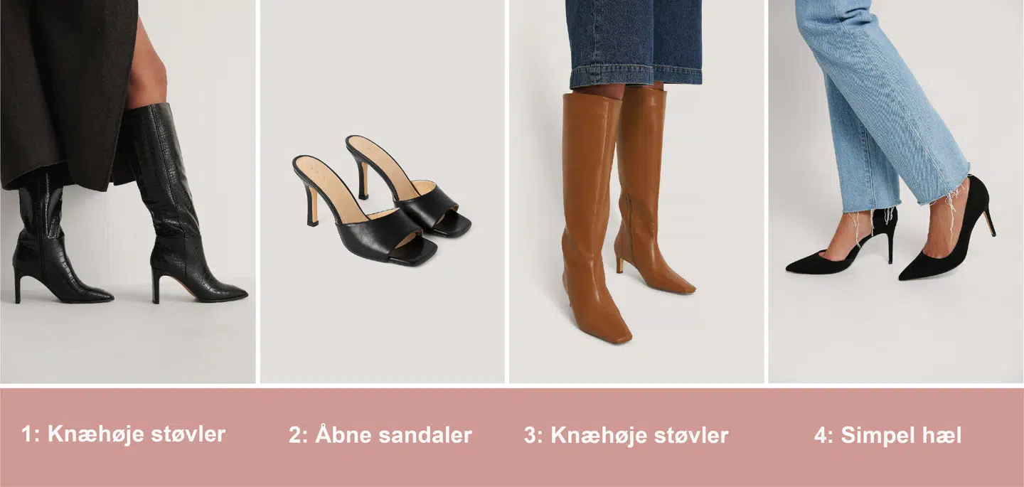 Med bredere, korte ben skal du gå efter en simpel sko. Vælg gerne sko, der er åbne i spidsen, eller et par lækre støvler, der går til under knæet.