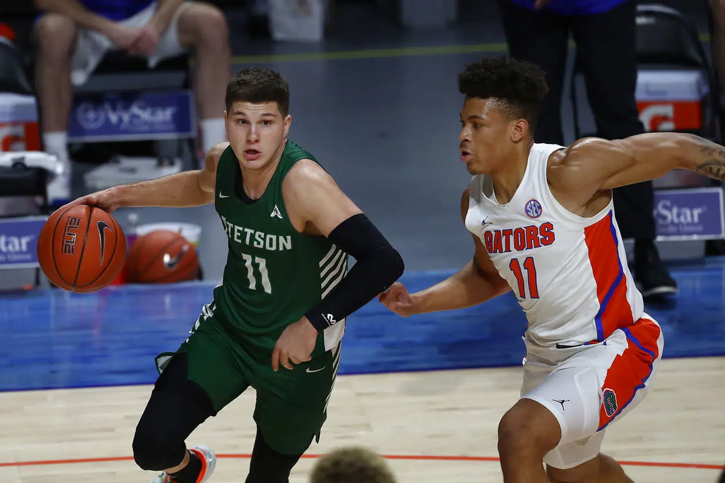 Kampen var mellem Gators og Florida State Seminoles, og Keyontae Johnson havde lige scoret et mål for Gators og fejret det, da der blev holdt timeout.